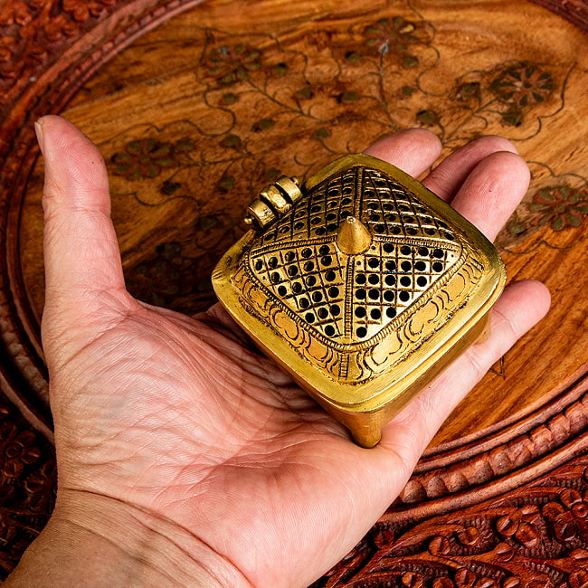 こちらは日本ではほとんど知られていない、樹脂香を焚くためのお香たてです。樹脂香とは、ガムみたいな樹脂になっているお香を火が付いた炭の上に乗せ、溶けて燃えて過程で、大量の煙と強い香りを放つものです。強い香りが好きなアラブ圏で日常的に使用されていて、もちろんインドでも使用されています。この樹脂香のメリットはタケを焼いたような焦げ臭い匂いが混じらないこと。