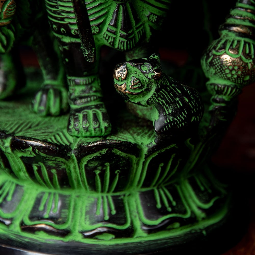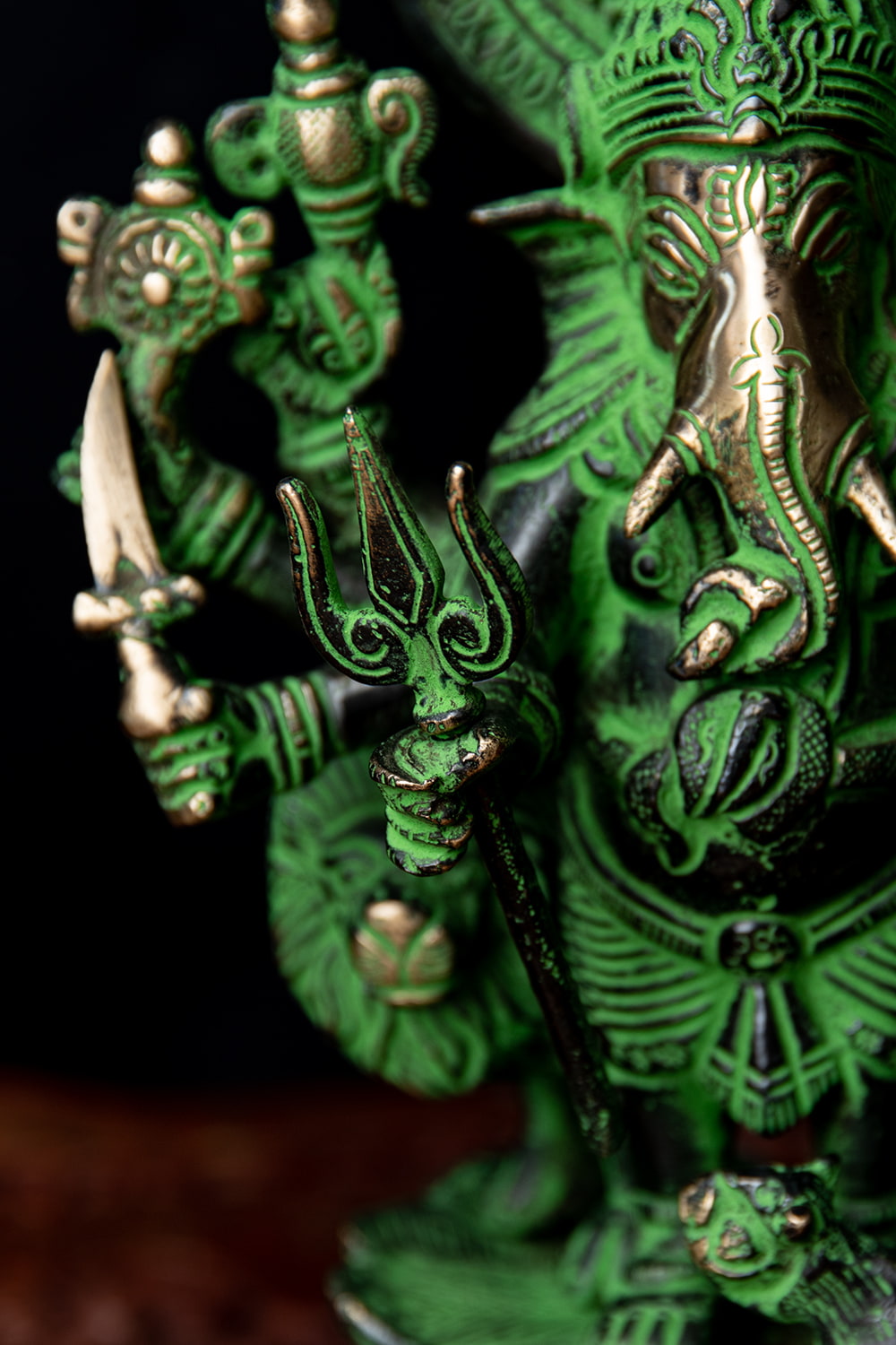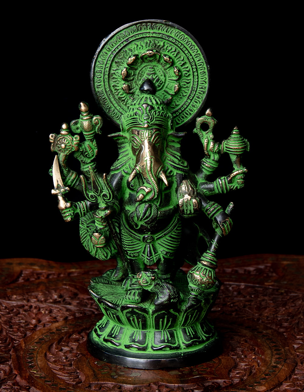 獅子を従えるガネーシャ - 高さ23.5cmの写真獅子を従えるガネーシャ - 高さ23.5cm 2 - 顔のアップです。峻厳な印象を与えるガネーシャ像です。獅子を従えるガネーシャ - 高さ23.5cm 3 - 角度を変えて見てみました。獅子を従えるガネーシャ - 高さ23.5cm 4 - 角度を変えて見てみました。獅子を従えるガネーシャ - 高さ23.5cm 5 - 手には好物のモーダカを持っています。獅子を従えるガネーシャ - 高さ23.5cm 6 - 三叉の槍を持っています。シヴァ神との関連性を感じさせます。獅子を従えるガネーシャ - 高さ23.5cm 7 - 細部を見てみました。獅子を従えるガネーシャ - 高さ23.5cm 8 - 足元にはガネーシャの乗り物であるネズミがいます。獅子を従えるガネーシャ - 高さ23.5cm 9 - 獅子を従えています。獅子を従えるガネーシャ - 高さ23.5cm 10 - 上からの様子です。獅子を従えるガネーシャ - 高さ23.5cm 11 - 背面の様子です。