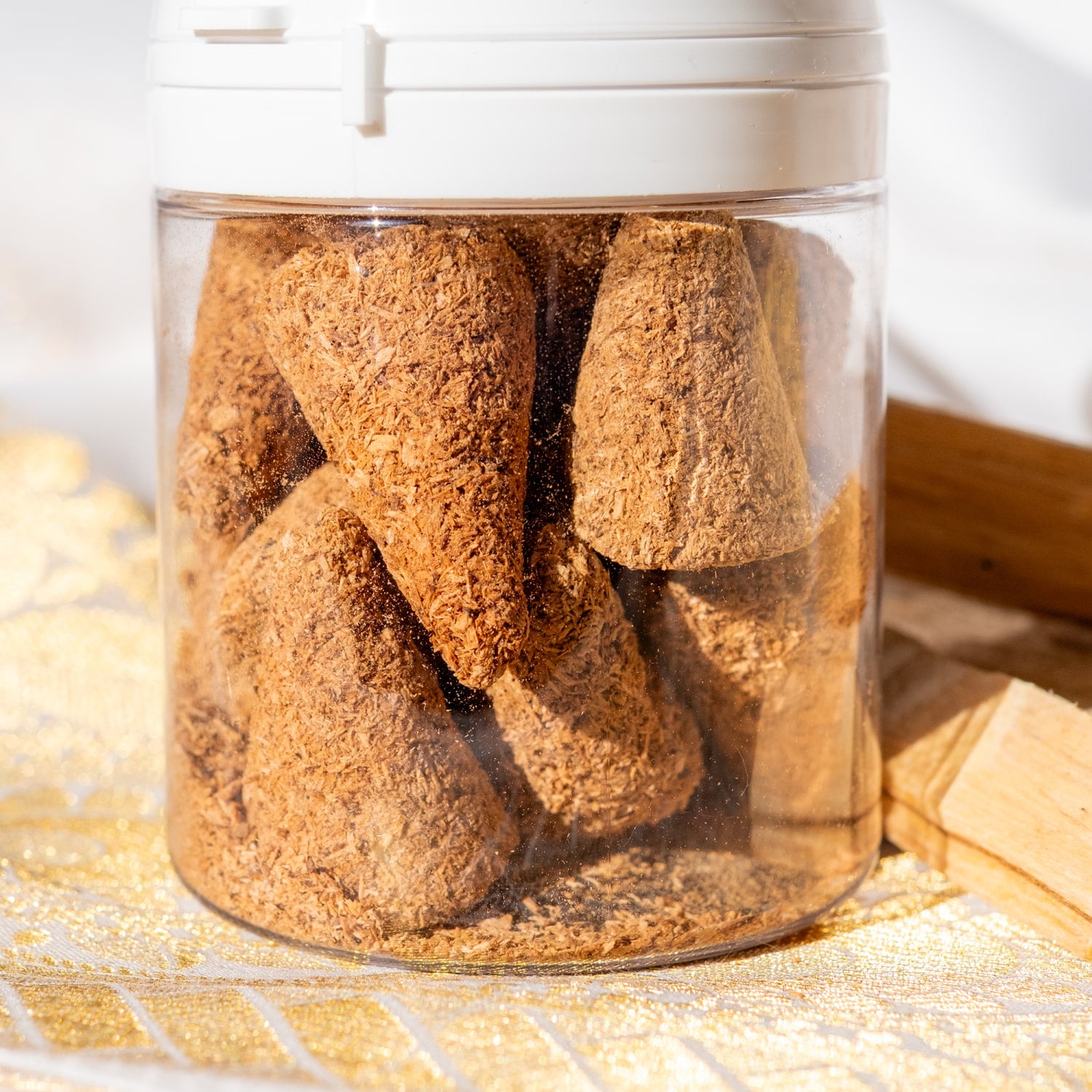 また、余計なものは使わず、圧着して形を作っているので、形はまちまちでどうしても部分的な欠け等がございますので、予めご了承くださいませ。パウダー状になった部分も入っておりますが、そちらはおまけ兼緩衝材として入れております。お皿に入れて直接火を付けていただくか、熱した炭の上に振りかけることで、抹香のように香りを楽しむこともできます。