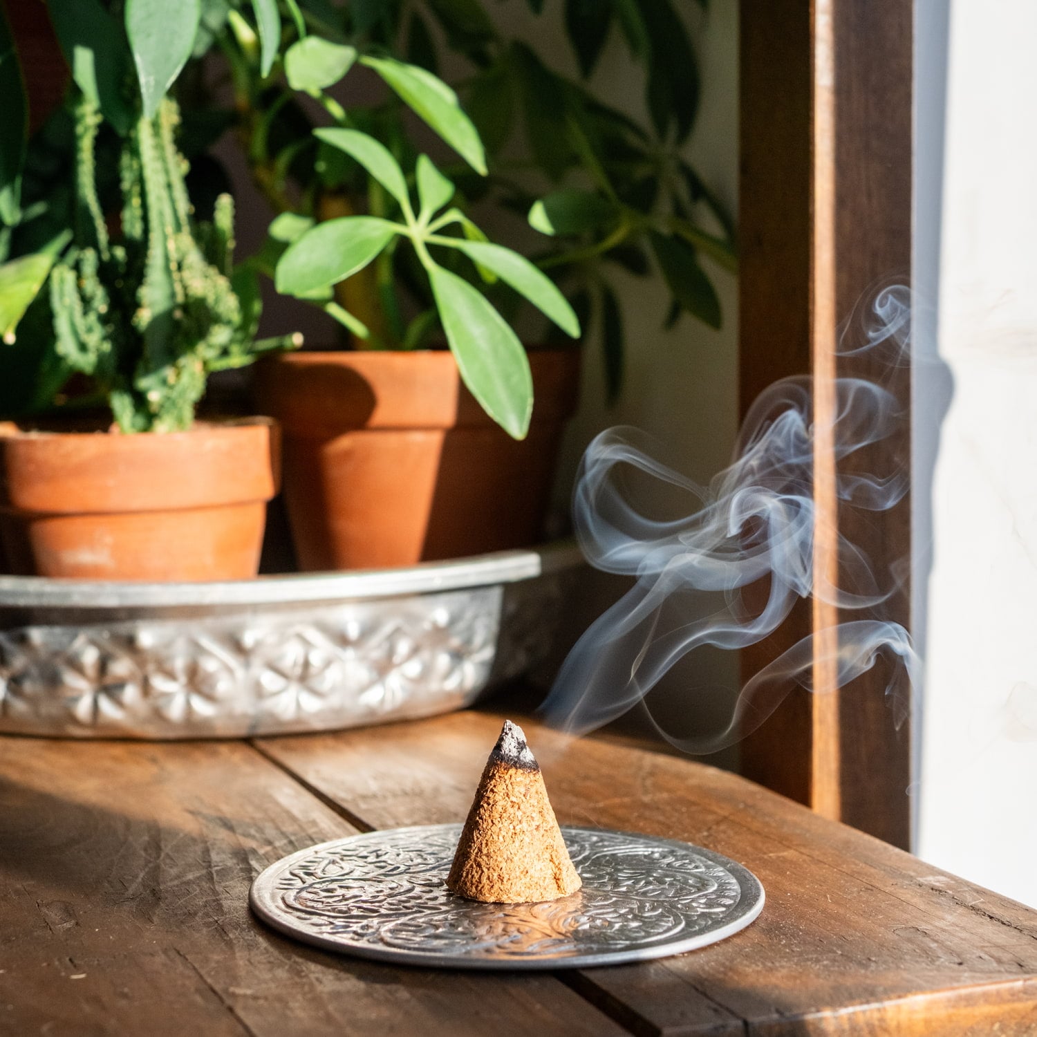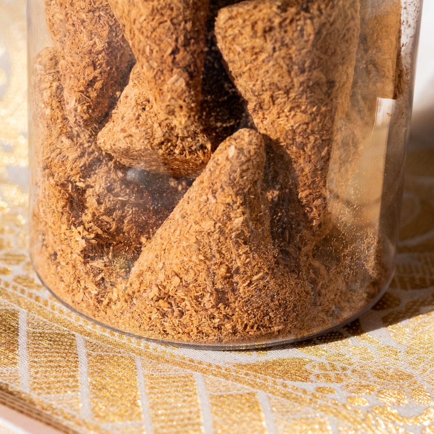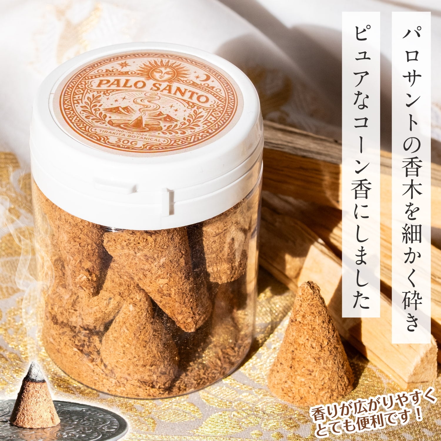 こちらはパロサントの香木を細かくして、圧着して作られているコーン香です。パロサント系のお香というのはインドでもよくありますが、あくまでパロサントを素材の一部として使っていたり、香りのコンセプトとしている物となります。一方でこちらのコーン香は、パロサントの香木のみを素材としているので、純粋なパロサントそのもの。火を付けると、パロサントのとてもピュアな香りがします。スティック状の香木と異なり、既存のコーン香用のお香たてやお皿が使え、燃焼し易く香りが良く広がります。
