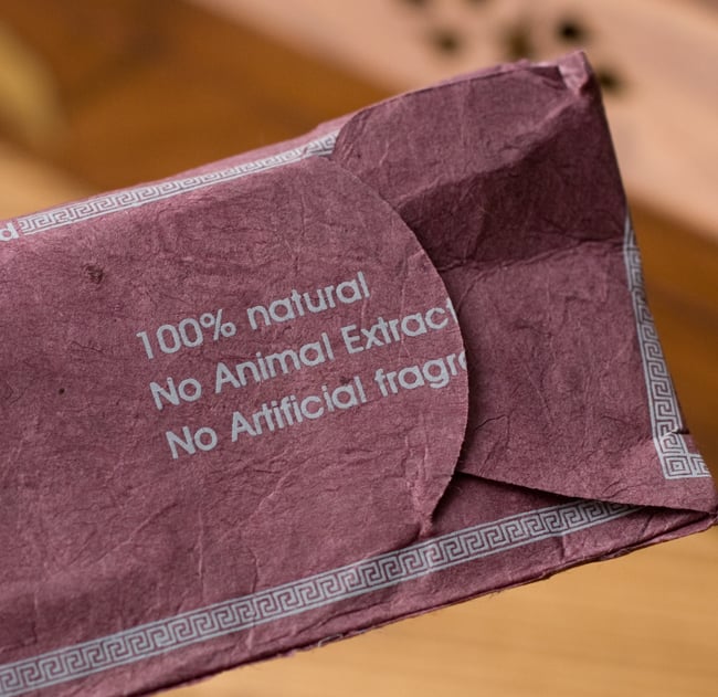パッケージにヒマラヤの花が貼り付けてある、おしゃれなナチュラル香。100%自然素材でできており、精油や動物性成分は無添加なので安心です。インドのお香をサイケデリックな原色に例えるなら、こちらのネパール香は優しいパステルカラーといったかんじ。