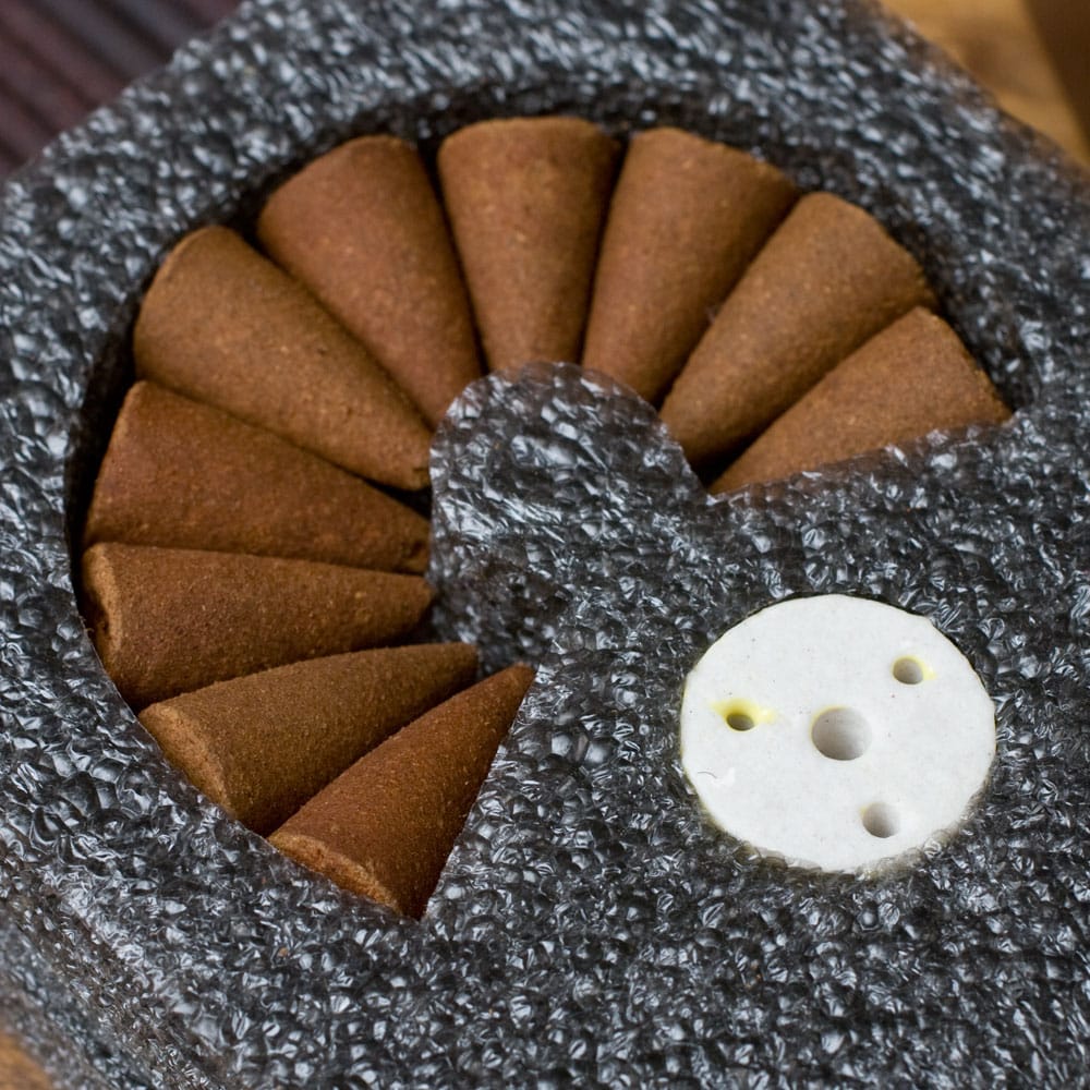 中にはコーンお香が10個、小さな陶器のお香たて、スティックタイプのお香が20本程度入っていますので、コーン香とスティック香の、両方をお楽しみいただけます。