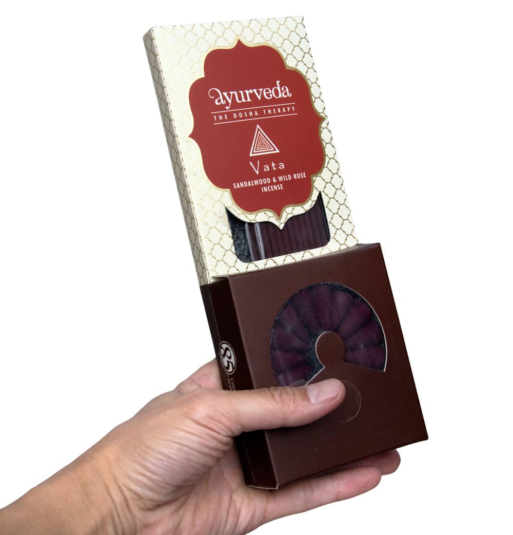 こちらのお香、アーユルヴェーダシリーズは、インドのアーユルヴェーダで言われている、3つの体質(ドーシャ)別に香りをセレクトしたもので、各体質によく合う配合がなされています。配合されている香りは没薬・フランキインセンスなど、人類が古来から使ってきたものもありますが、カヤツリグサなど、他のお香シリーズでは見かけないものも含まれている本格派です。