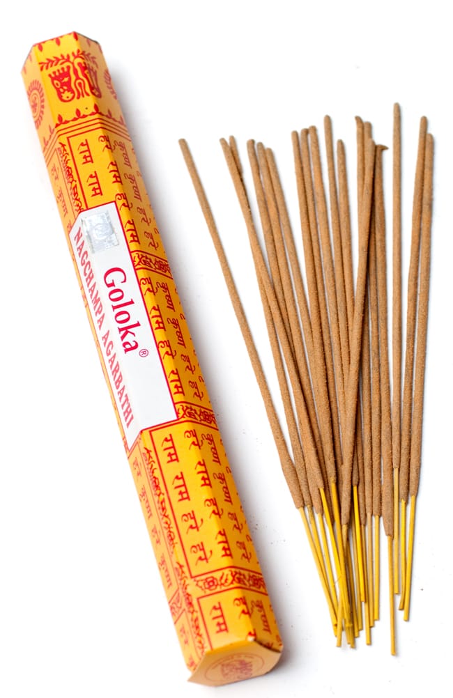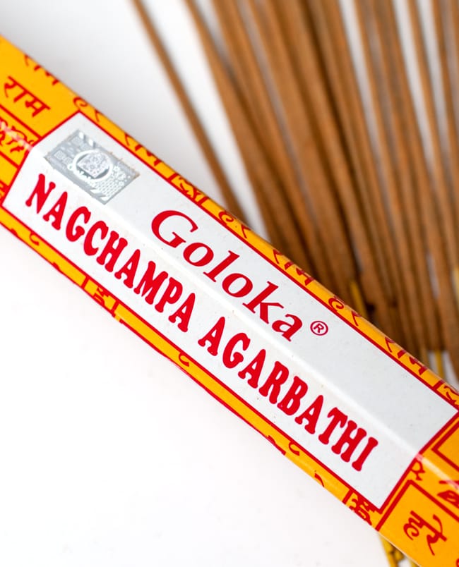 インド風なデザインが欧米諸国で人気のGoloka社のナグチャンパ香。ふんわりとしたやさしと、スパイシーさが混ざり合ったとても良い香りです。同じナグチャンパと言う銘柄で有名なサイババのものもありますが、こちらの方が好き!という方も多い品です。両方試してみるのもいいかもしれませんね。