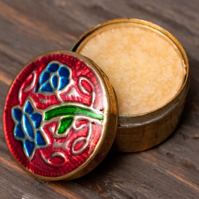 七宝で装飾された金属ケース入りです。クリーム・フレグランスを使い終わった後は指輪入れやピルケースとしてお使いいただけます。紫の化粧箱入りですのでギフトにぴったりです。インドからのおみやげや、好きな人へのプレゼントに最適だと思います。![【6個セット】クリーム・フレグランス[ブラス] - バラの香り(ローズ)の写真](https://www.tirakita.com/ind_ins/Photos/ind_ins_552.jpg)
