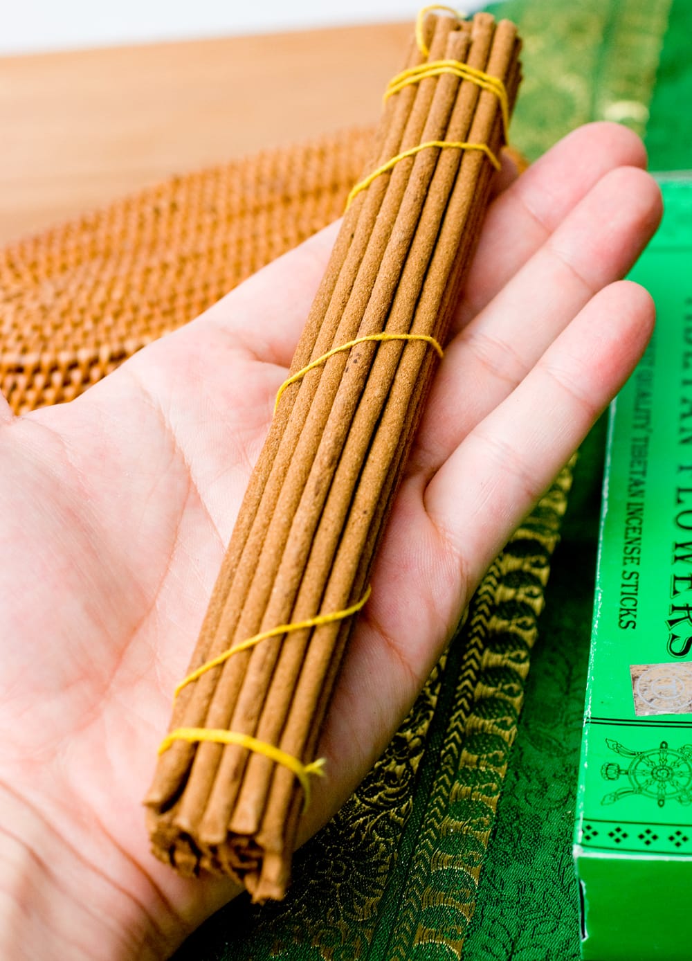 職人が自然の素材からすべて手造りしたこのお香はチベット香はインド香のように派手で明るい香りはしません。ヒマラヤ山脈周辺地域の山々に自生している天然のハーブ、木の根、天然の香料などの現地で良薬とされている自然から採取できるもののみを用いて、作り上げているからです。その香りはあなたに穏やかな時間を与え、纏わりつく緊張を取り除き、安心感を身体の隅々までゆきわたらせて、とてもリラックスさせてくれるでしょう。ヨガにも最適です。人工的なもので出来ていない、ナチュラルな珍しいお香をお楽しみください。