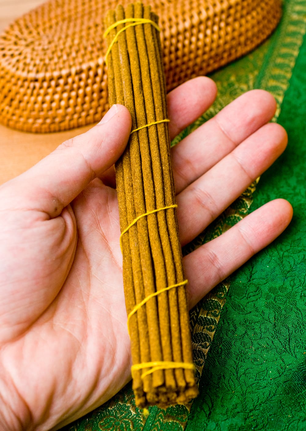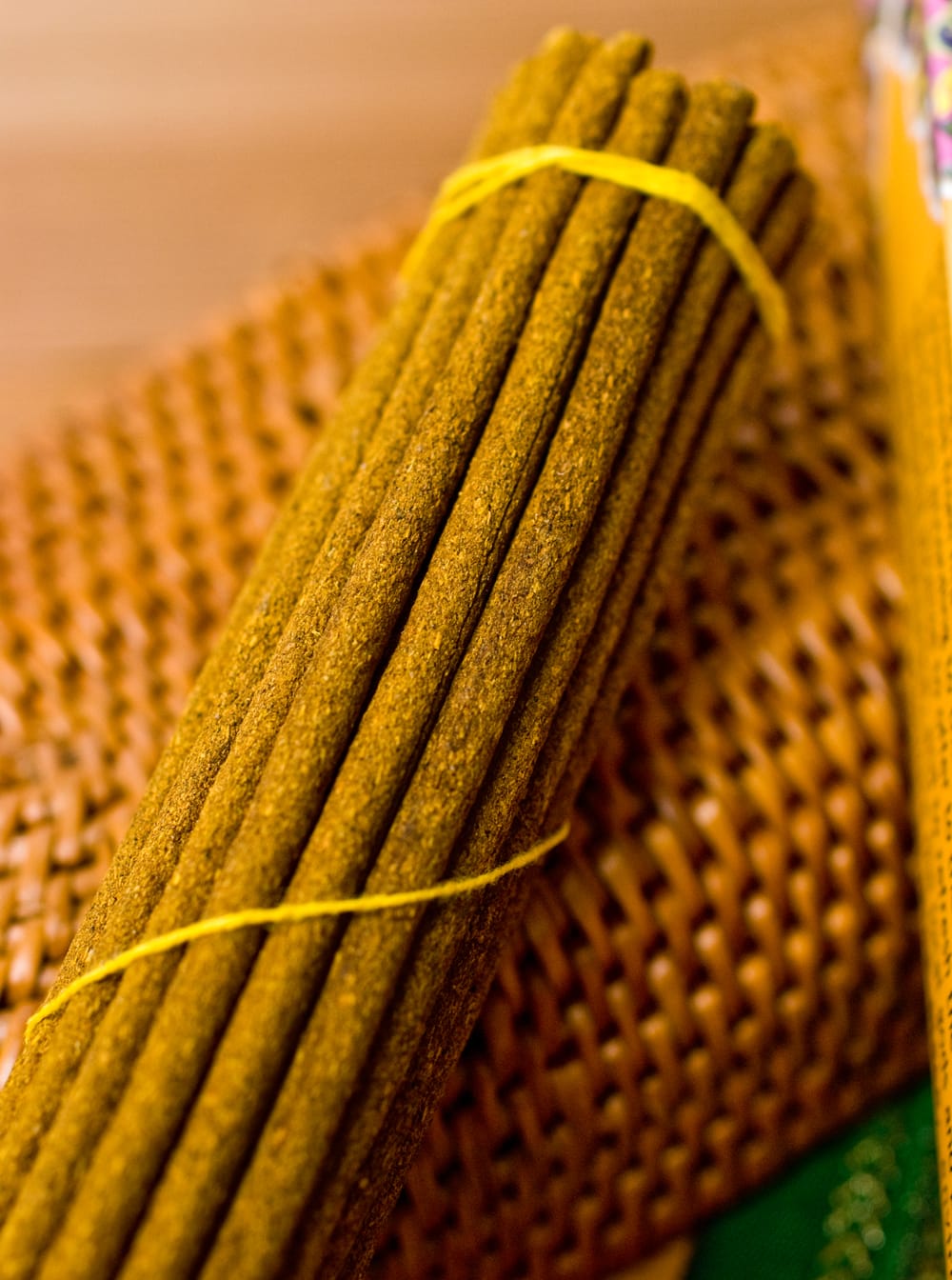 チベットのお香の特長はナチュラルオイル、花、スパイス、ハーブ、などの天然素材を昔から伝承されるレシピに基づいて混ぜて作ったチベタン香です。古代から連綿と伝わるお香づくりの特別なレシピに則って人工的な化学物質を使用せず、天然素材で調合されています。ネパールやチベットに古くから伝わる伝統的な成分と配合で作られている特別なお香です。職人の手造りなので、ちょっとうねっていたり、お香の先端が少し尖っていたり、手造り感が感じられます。