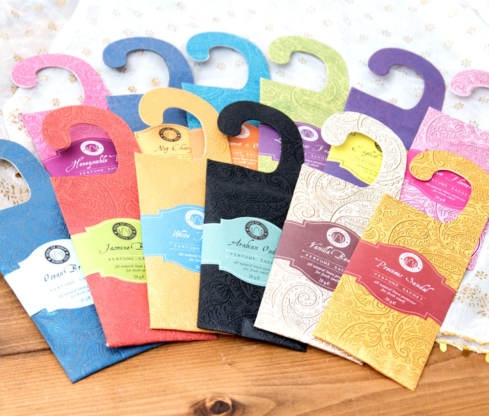 Song of Indiaブランドから、新しいお香が登場しました。 こちらの商品は洋服ダンスの中に入れておくと衣類に匂いが移る、サシェと呼ばれる香り袋です。 車の中や玄関先、トイレやお部屋の中の芳香剤としてもお使いいただけます。 パッケージがフックになりますのでそのまま吊るしてお使いくださいませ。■火が要らないので安心!