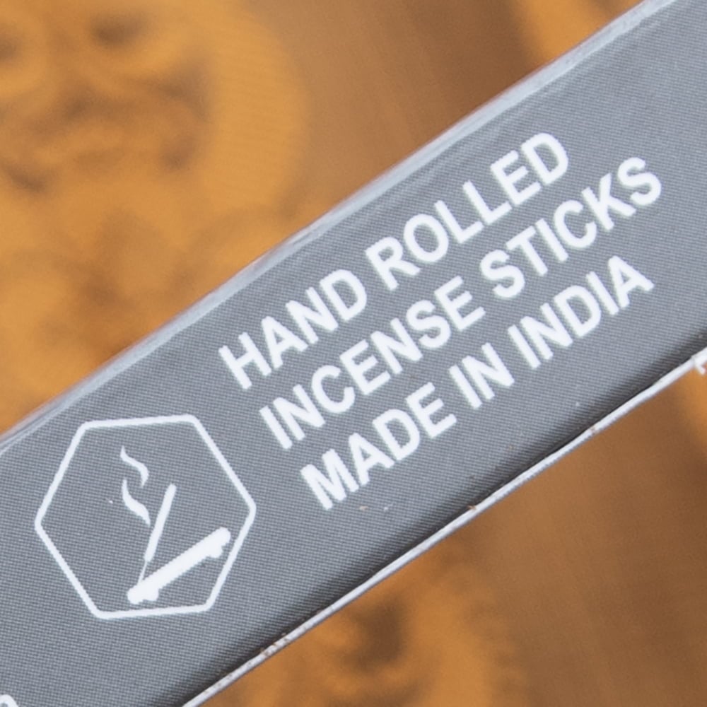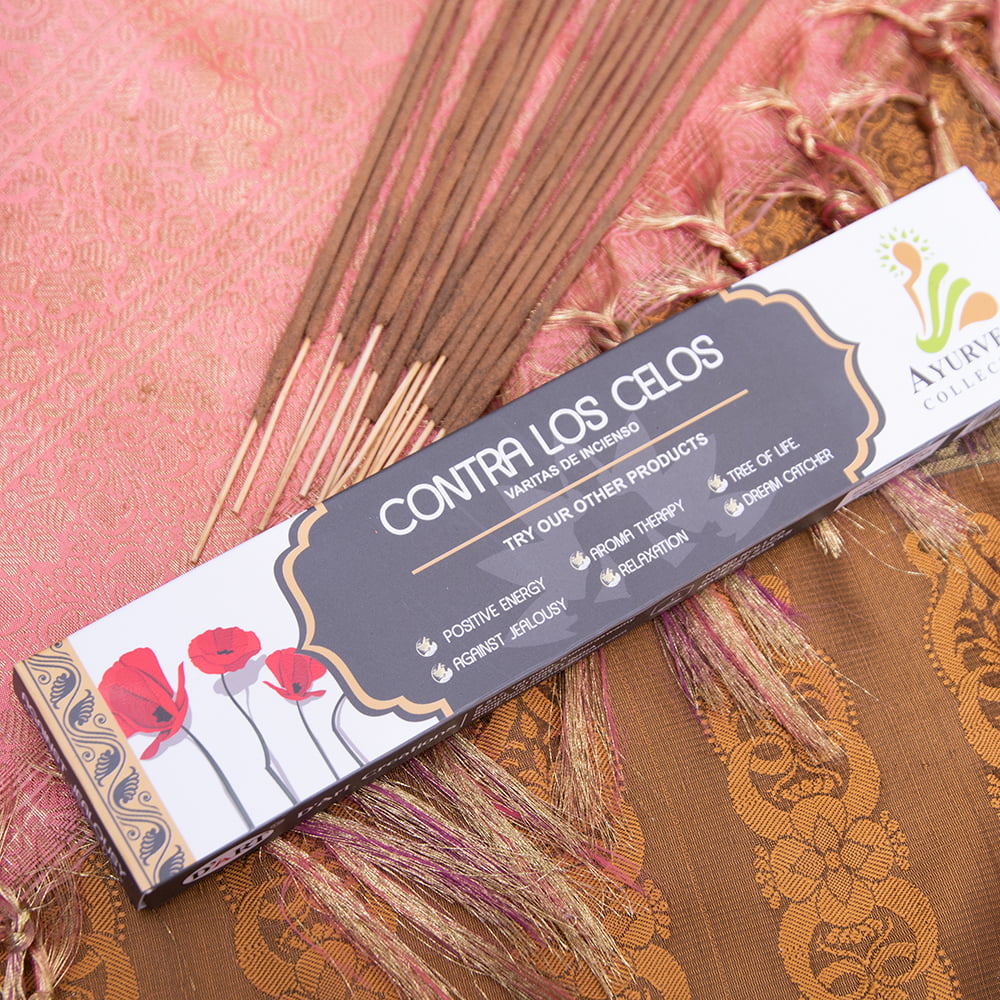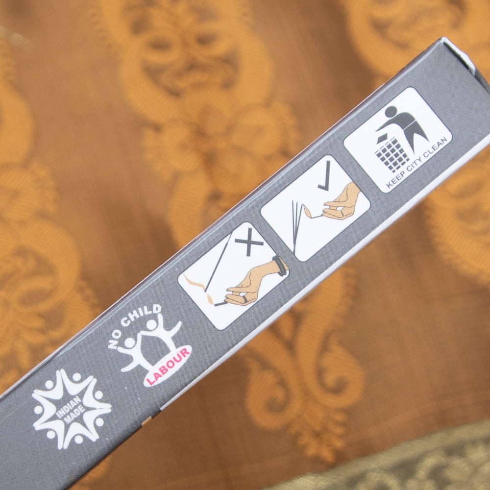インドでは高級なお香と普通のお香を見分ける非常に簡単な方法があります。その方法とは、お香の表面に香りパウダーが付いているかどうかを見る方法です。もちろん、色々なお香がありますので一概にパウダーが付いていれば高級というわけではありませんが、お香の表面にパウダーが付いているということは、通常のお香よりも一手間かけている訳で、その分、人件費も材料代もかかるのです。こちらのお香もそんな高級インセンスの一つ。「Against Jealousy」-嫉妬心に負けないという名前のこちらもいい香りのパウダーがびっしり付いています。
