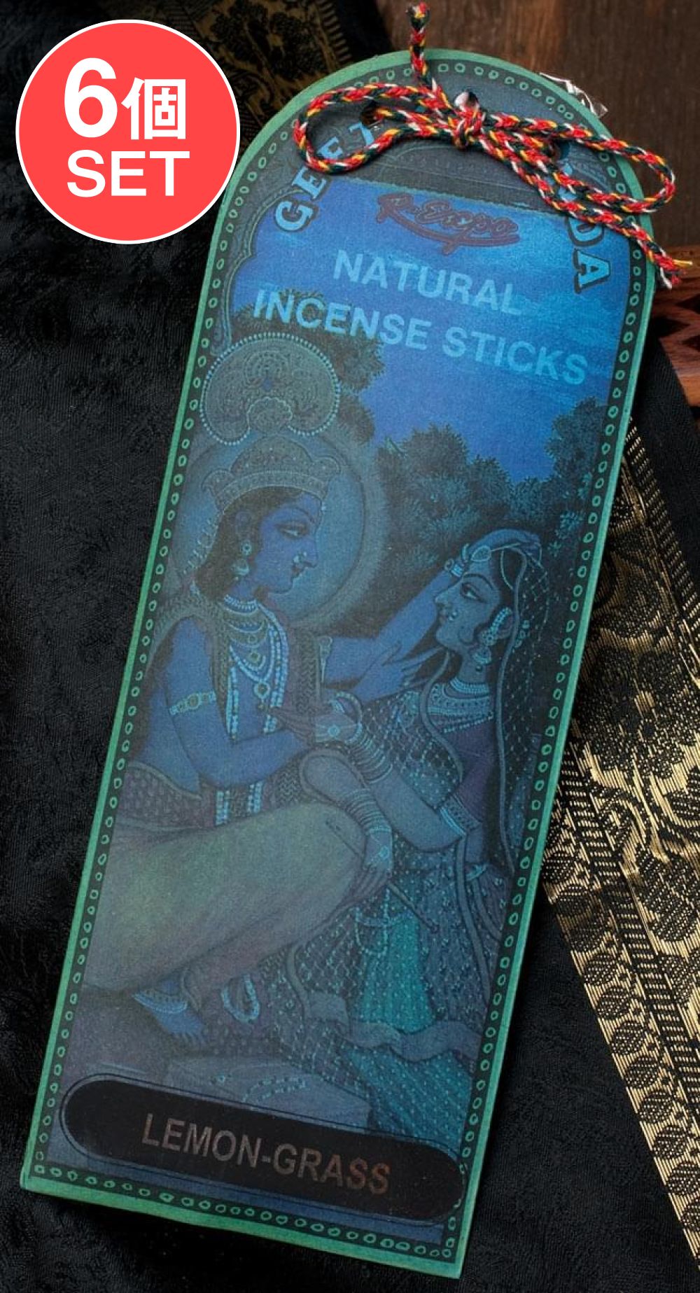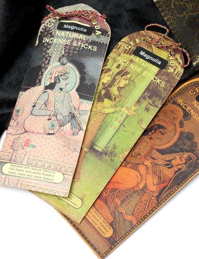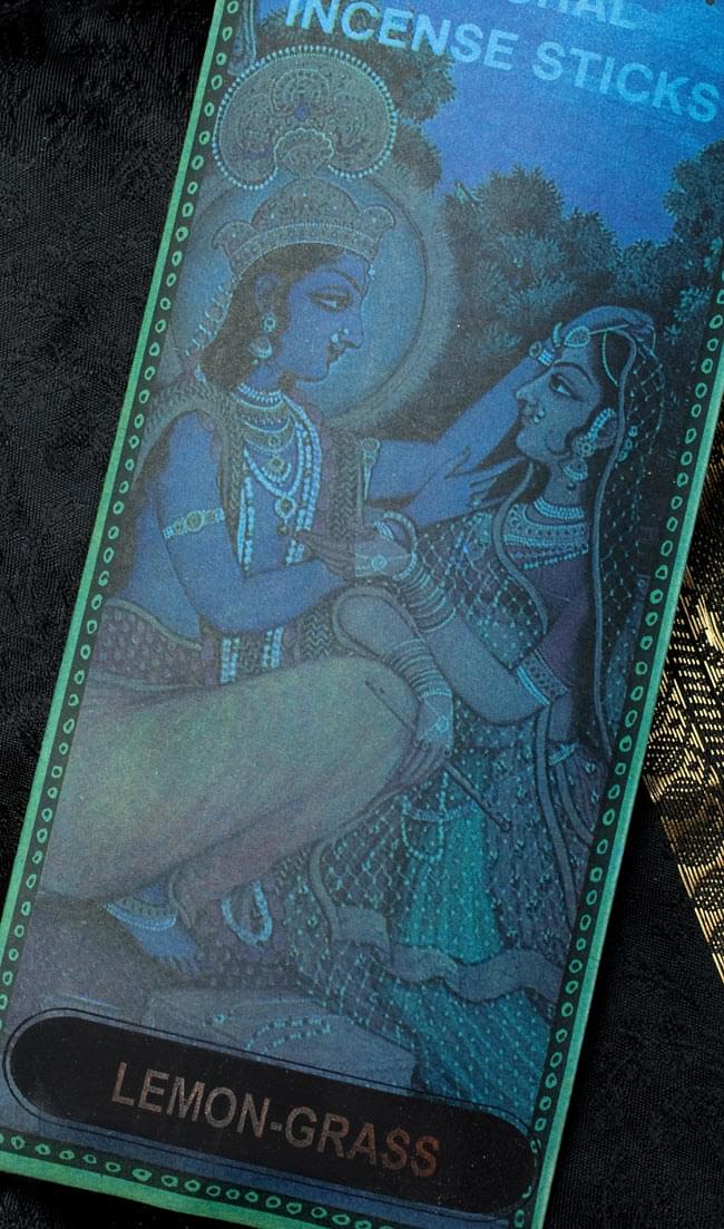 ヒンドゥー教の最高神であるヴィシュヌの7番目の化身といわれるクリシュナ。ビシュヌの化身の起源ともいわれ、強くて男前な、いわゆるプレイボーイの神様です。そんなクリシュナと恋人の娘、ラーダとの愛の物語が「ギータ・ゴーヴィンダ」という叙事詩。このお香のモチーフになっています。パッケージは、その愛の物語をテーマに、インドの伝統的なミニアチュール(精密画)が描かれとても雰囲気がある一品です。開口部もかわいい紐で留められていて、こだわりを感じます。