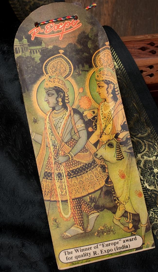 ヒンドゥー教の最高神であるヴィシュヌの7番目の化身といわれるクリシュナ。ビシュヌの化身の起源ともいわれ、強くて男前な、いわゆるプレイボーイの神様です。そんなクリシュナと恋人の娘、ラーダとの愛の物語が「ギータ・ゴーヴィンダ」という叙事詩。このお香のモチーフになっています。パッケージは、その愛の物語をテーマに、インドの伝統的なミニアチュール(精密画)が描かれとても雰囲気がある一品です。開口部もかわいい紐で留められていて、こだわりを感じます。