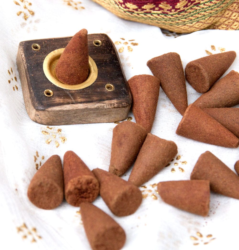オーガンジーの袋の中には、コーン香が20個ほどと、木製のお香たてが入っていますので、この袋一つでお香を安全に焚くことができます。全部入りセットですので、安心してプレゼント、ご購入いただけます。