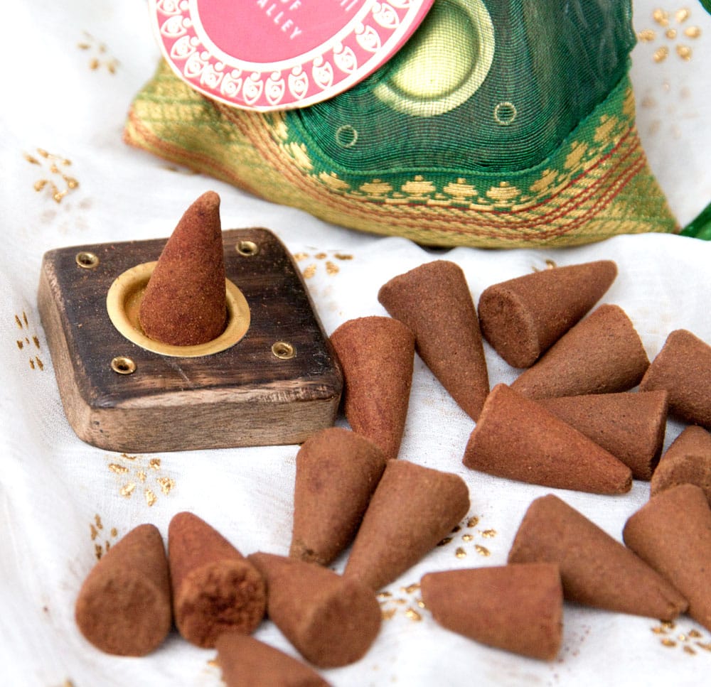 オーガンジーの袋の中には、コーン香が20個ほどと、木製のお香たてが入っていますので、この袋一つでお香を安全に焚くことができます。全部入りセットですので、安心してプレゼント、ご購入いただけます。