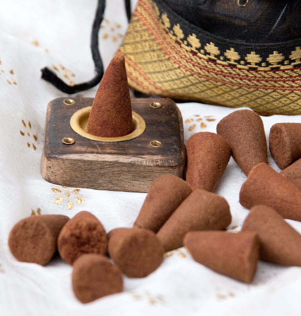 オーガンジーの袋の中には、コーン香が20個ほどと、木製のお香たてが入っていますので、この袋一つでお香を安全に焚くことができます。全部入りセットですので、安心してプレゼント、ご購入いただけます。