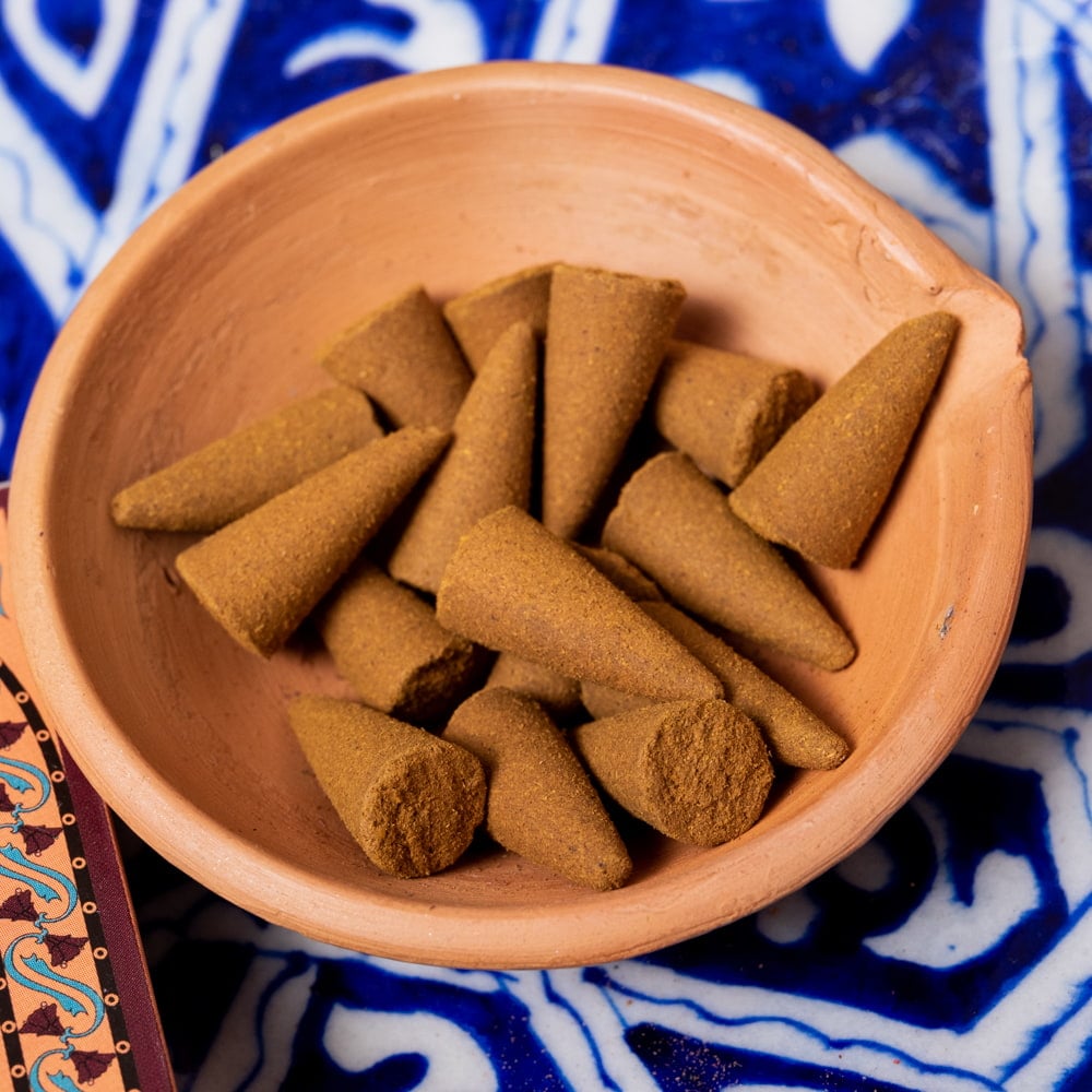 こちらのお香は、インドの伝統的な製法で作られたお香です。それぞれ、サンダルウッドや、樹脂、ハーブ、天然の花などから抽出した香り豊かな芳香油を加え、手作りのウッドブロックでコーンの形を型取り、ハンドメイドされております。