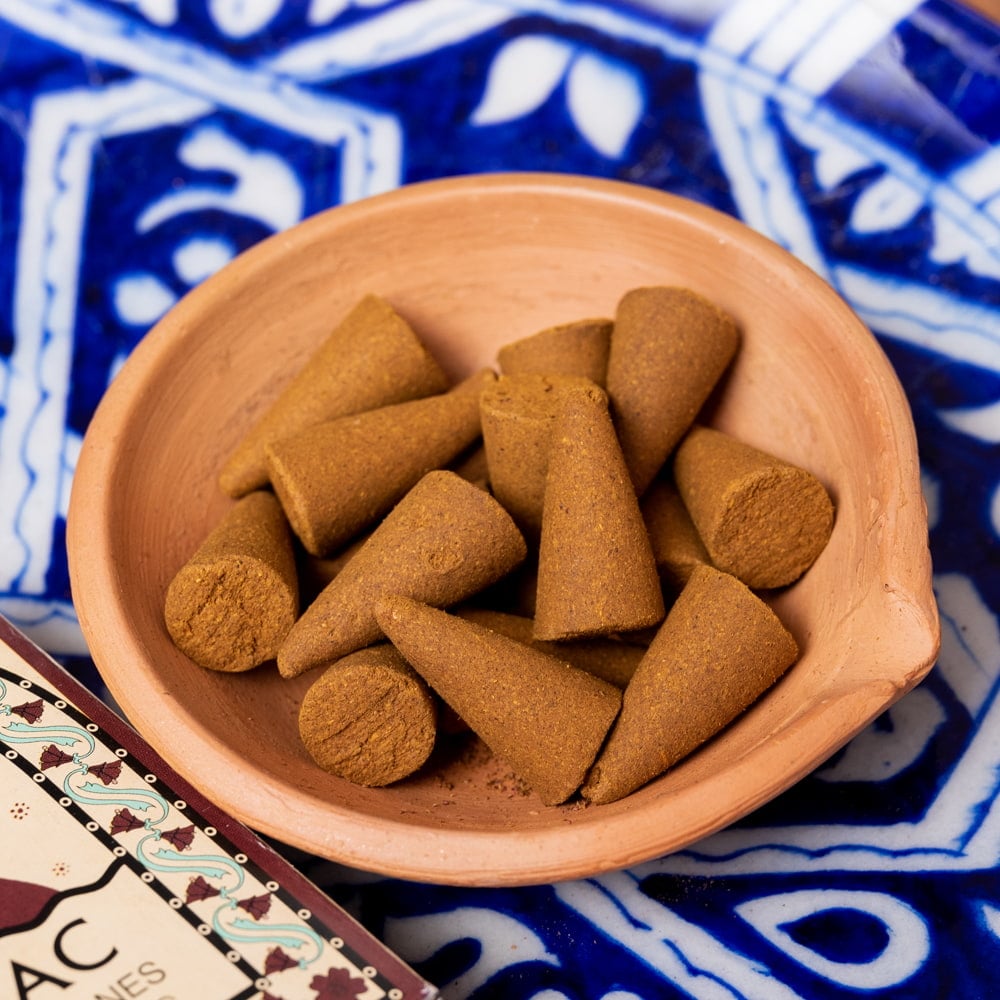 こちらのお香は、インドの伝統的な製法で作られたお香です。それぞれ、サンダルウッドや、樹脂、ハーブ、天然の花などから抽出した香り豊かな芳香油を加え、手作りのウッドブロックでコーンの形を型取り、ハンドメイドされております。
