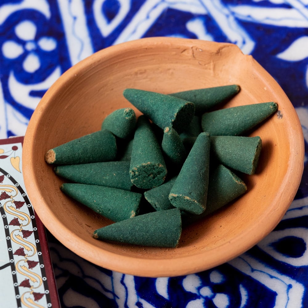 こちらのお香は、インドの伝統的な製法で作られたお香です。それぞれ、サンダルウッドや、樹脂、ハーブ、天然の花などから抽出した香り豊かな芳香油を加え、手作りのウッドブロックでコーンの形を型取り、ハンドメイドされております。