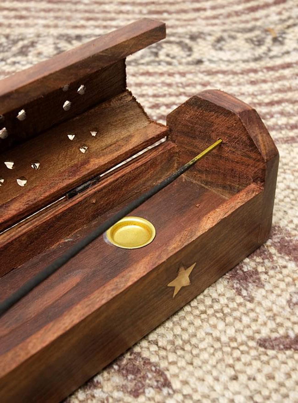 今まで使っていたものを他所に譲ることにしたので新たに購入しました。同じ箱型で模様と形を少し変えたものをと選んだのがこちらでした。まだ少し蓋がきついけど気に入りました。お値段以上の質感でした。家具やビリヤードのキューなどにも多用される、インディアンローズウッドの木目が美しいです。私の個体は彫刻の装飾もも丁寧でした。ラッキーなことに、蓋と本体の段差もほとんどなく、開閉もスムーズにできます。しいて欠点をあげれば、内側左右にある横向きに香をさす穴が小さく、パッと見て見つからない時があるくらいです。インド製ですので、あくまでも個体差が生じることは承知しておいた方がいいかと思います。
