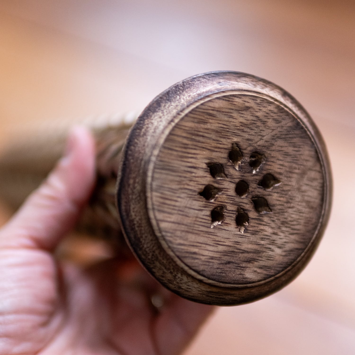 埋め込まれた金属の光沢と美しく彫刻された多数の飾り穴がマッチした美しい木製香立て。こちらのお香立ては、立てて置くタイプのお香立てで、、コーン香、スティックタイプのお香立てどちらでもご使用が可能です。