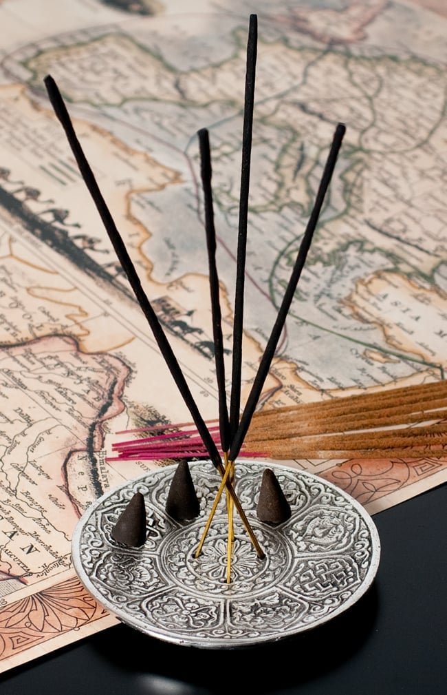 穴が底まで貫通しているので、インド香か、コーン香専用ですね。\r\nオイルランプとしては使えないです。樹脂香も垂れそうです。\r\n全長がすべて燃焼する日本の線香を立てることもあるので\r\n穴の下にアルミカップを敷いています。\r\nインド香はうまく立てないと、皿の外に灰がこぼれます。\r\n\r\nホワイトメタルという素材を見るのは初めてですが、お店の紹介どおり\r\nシルバーにもゴールドにもない独特の清潔感があります。\r\n持ってみると軽いところや、ぱっと見の質感がアルミにも似ている気がしますが\r\n金属らしい重厚さや光沢がある点で、やはり違います。\r\n\r\n八吉祥の文様の細かさと力強さは、一目で安い日用品とは違うことがわかります。\r\n五感のうち、認知や本能を司る大脳辺縁系へダイレクトに信号が届くのは嗅覚だけなんだとか。\r\n祭壇の中央部を飾るにふさわしい品格があります。\r\n\r\n【追記】\r\nインド香から落ちる灰がかなり熱いので、皿の外になるべく落とさないほうがよさそうですね。\r\nなんだか灰が落ちるたびに気になります。\r\n瞑想中は皿を下ろし、燃えにくいウールの厚手の絨毯に竹ヒゴ部分を挿して直立させるようにしました。\r\n 参考画像→