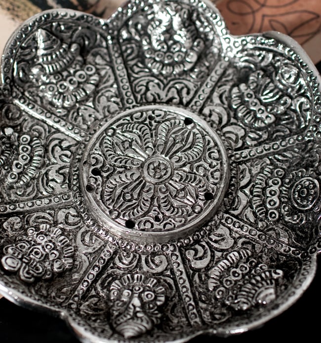 ![幸運の八吉祥柄と交差金剛杵 ホワイトメタルのお香立て[11.5cm] 5 - 裏面の写真です。こちらも装飾されております。](https://www.tirakita.com/ind_inshld/Photos/ind_inshld_635_5b.jpg)