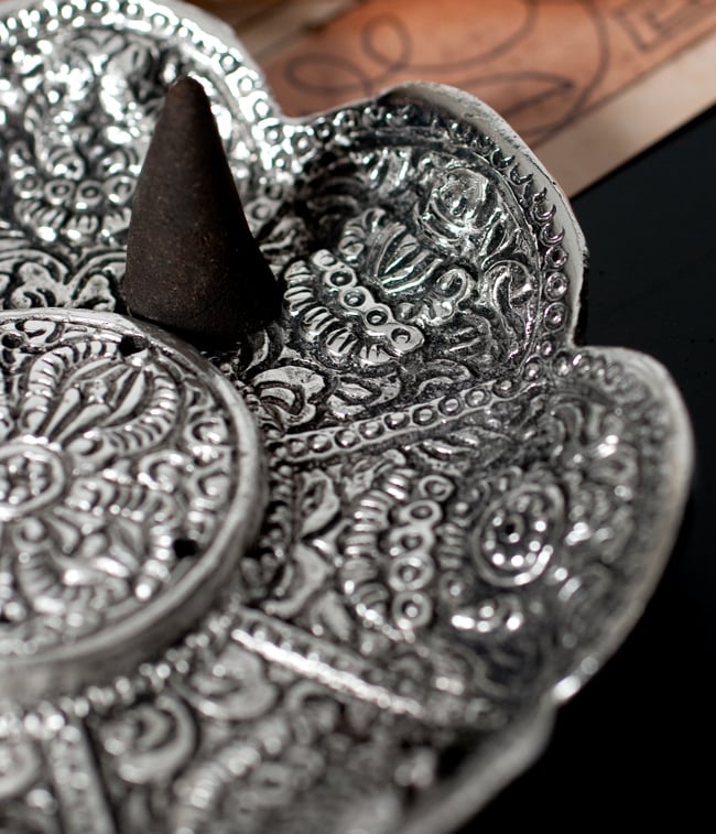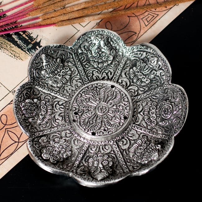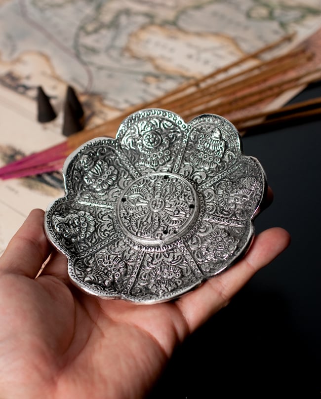 ![幸運の八吉祥柄と交差金剛杵 ホワイトメタルのお香立て[11.5cm] 4 - お皿部分も広いので、コーン香を置いたりもできます。](https://www.tirakita.com/ind_inshld/Photos/ind_inshld_635_4b.jpg)