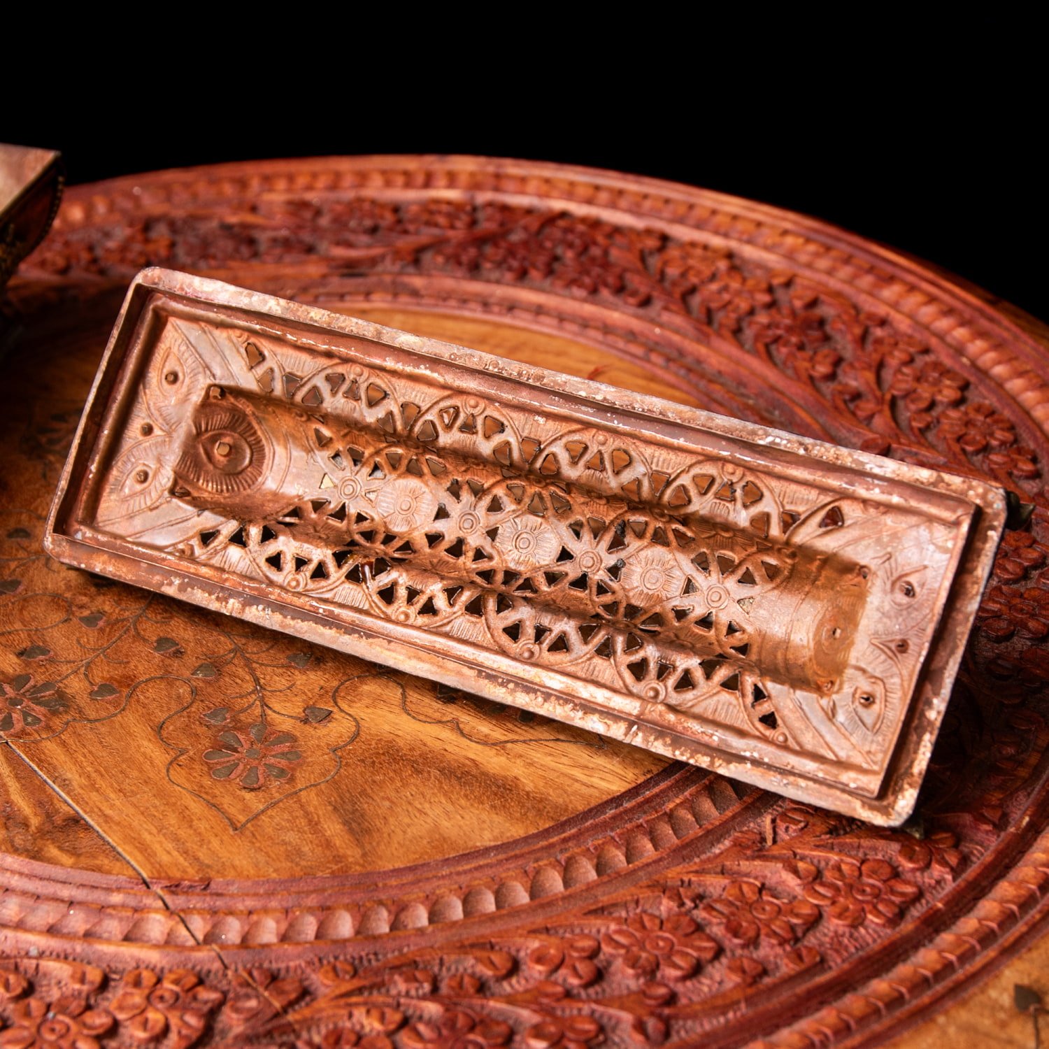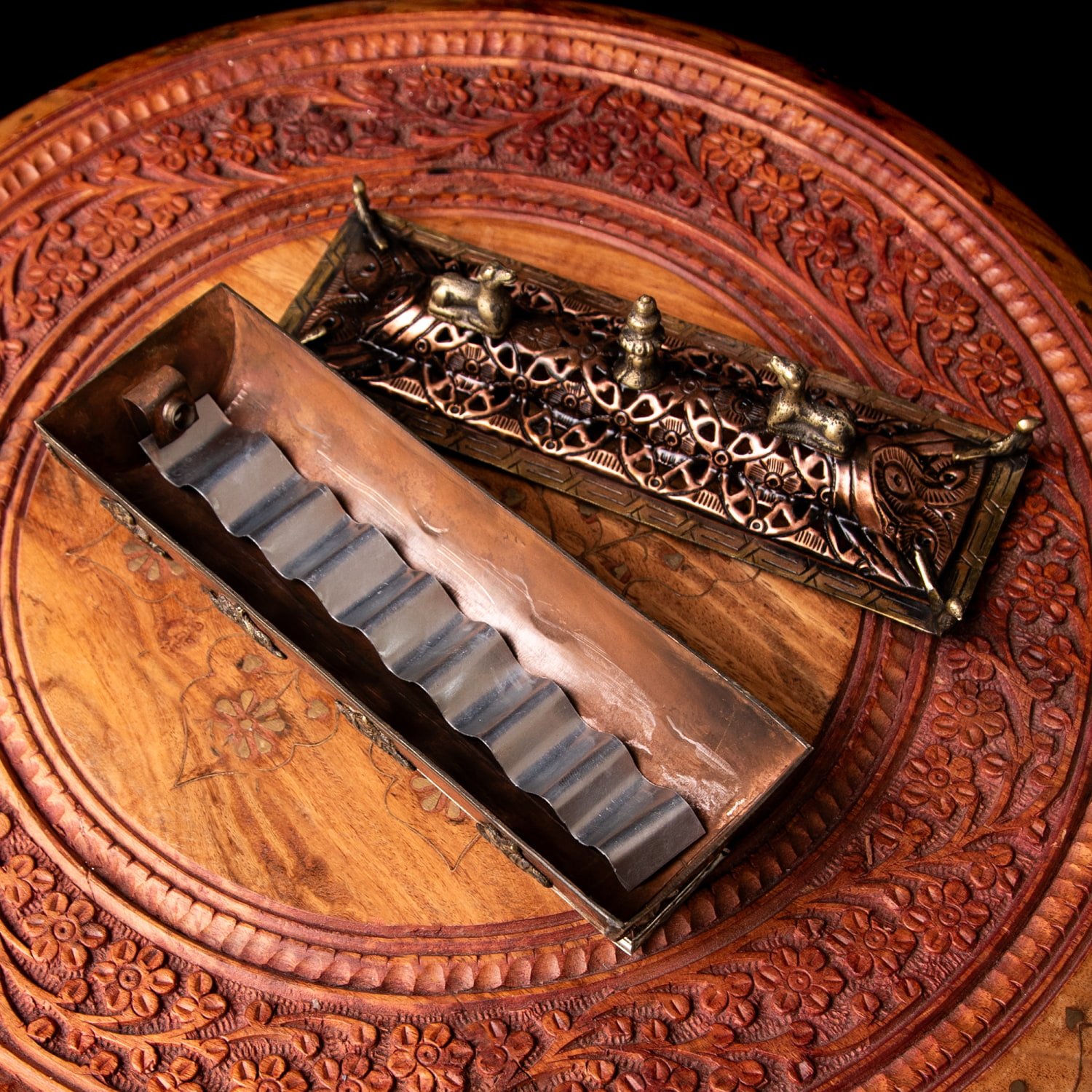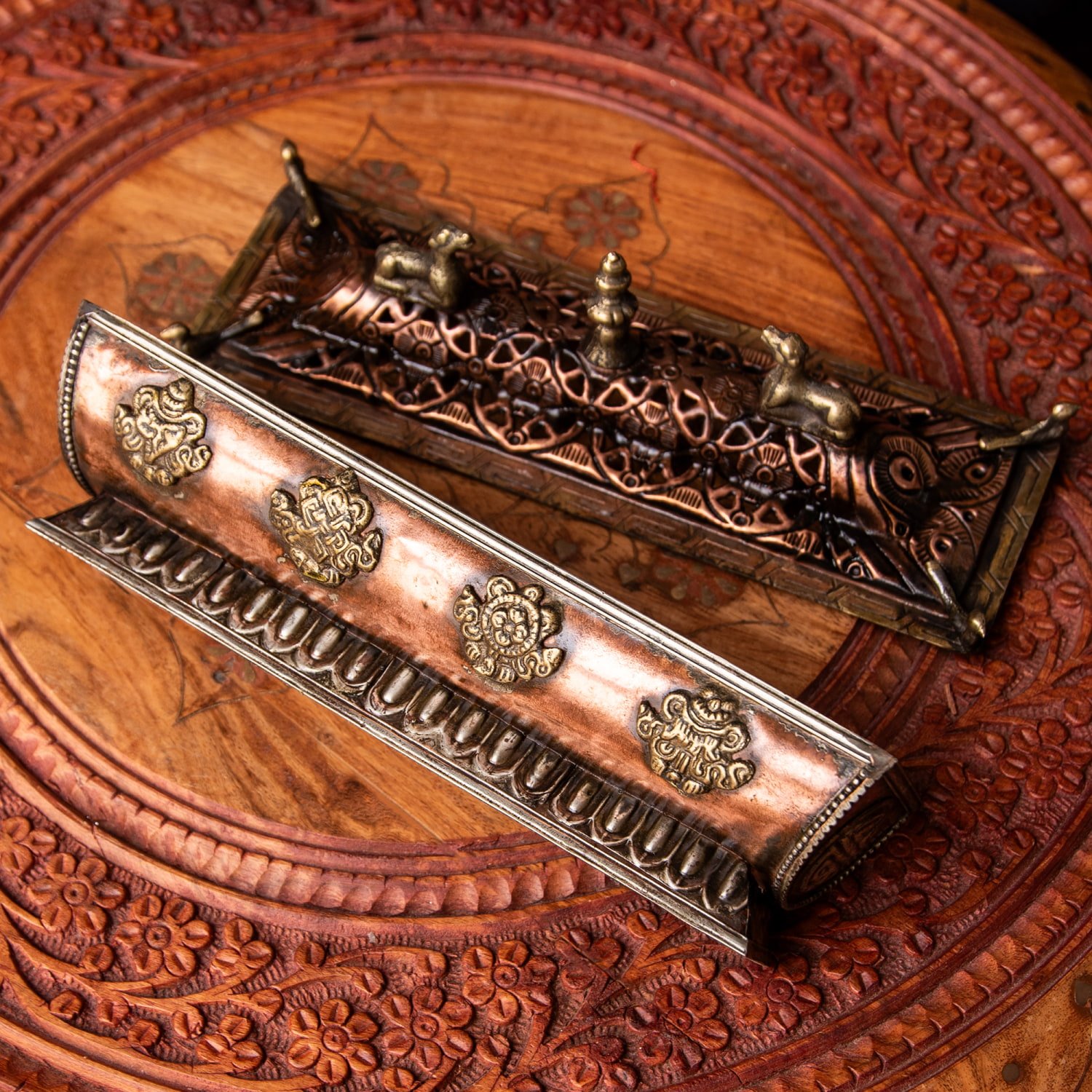 銅造り チベット香用 蓋付きお香立て 吉祥文様 【約21cm×約7.5cm】 通販店