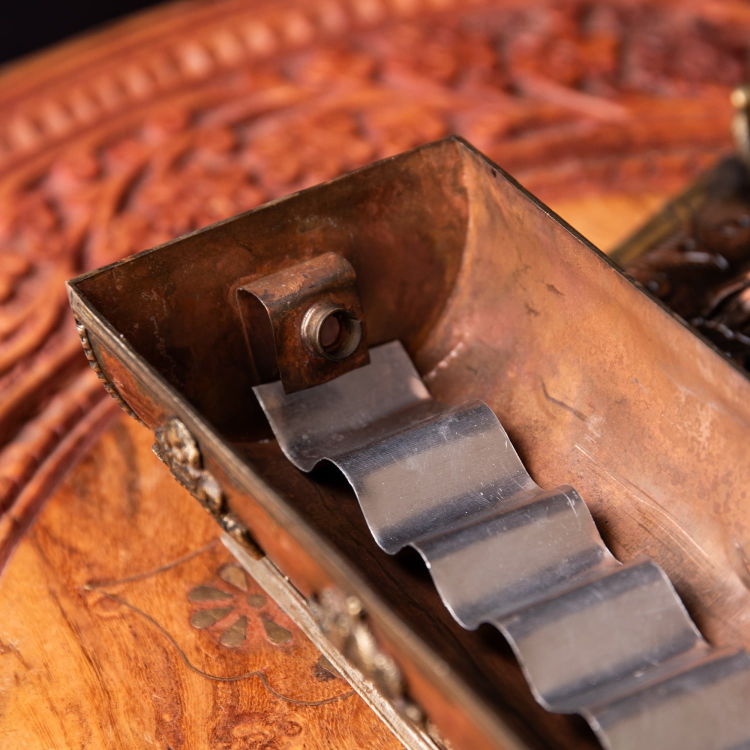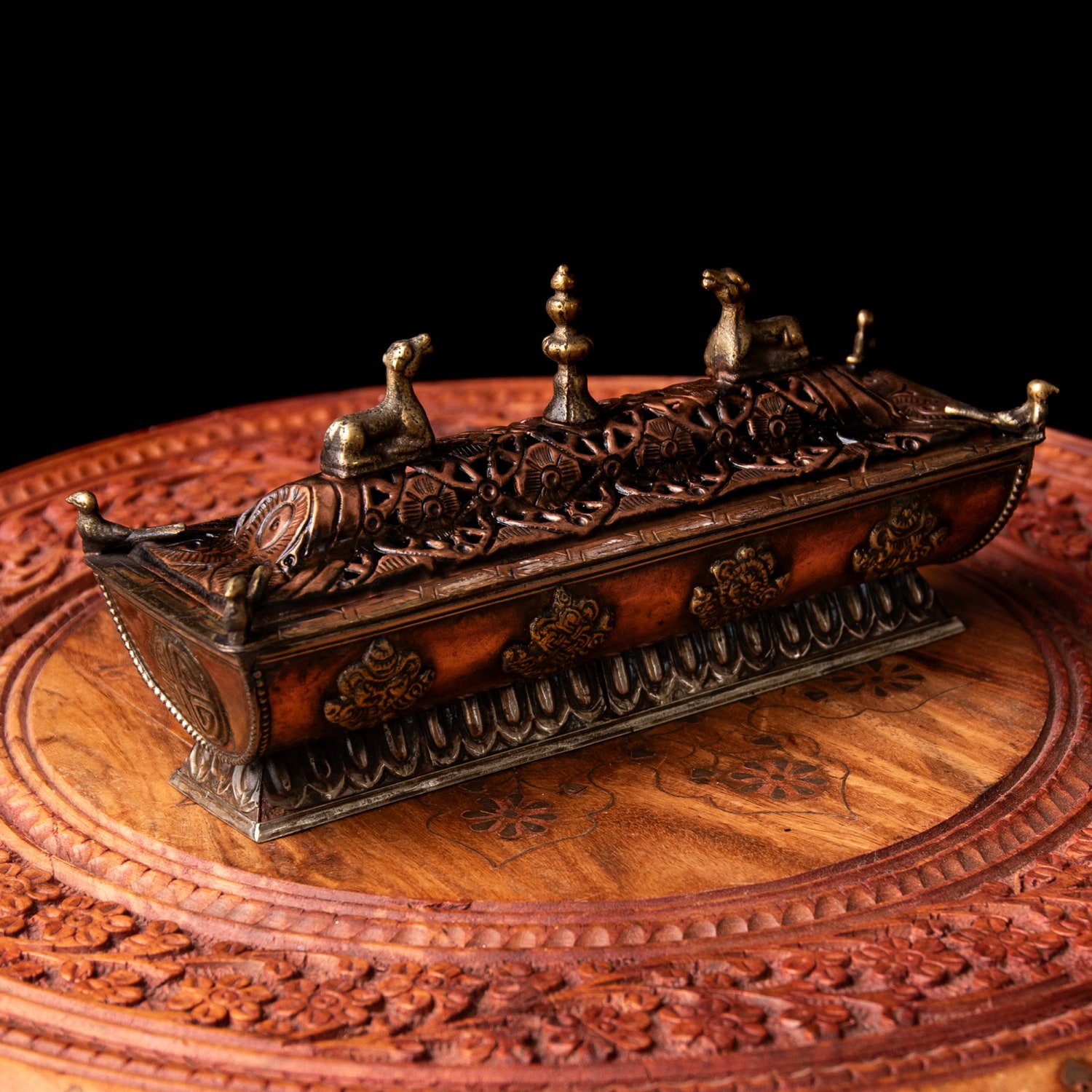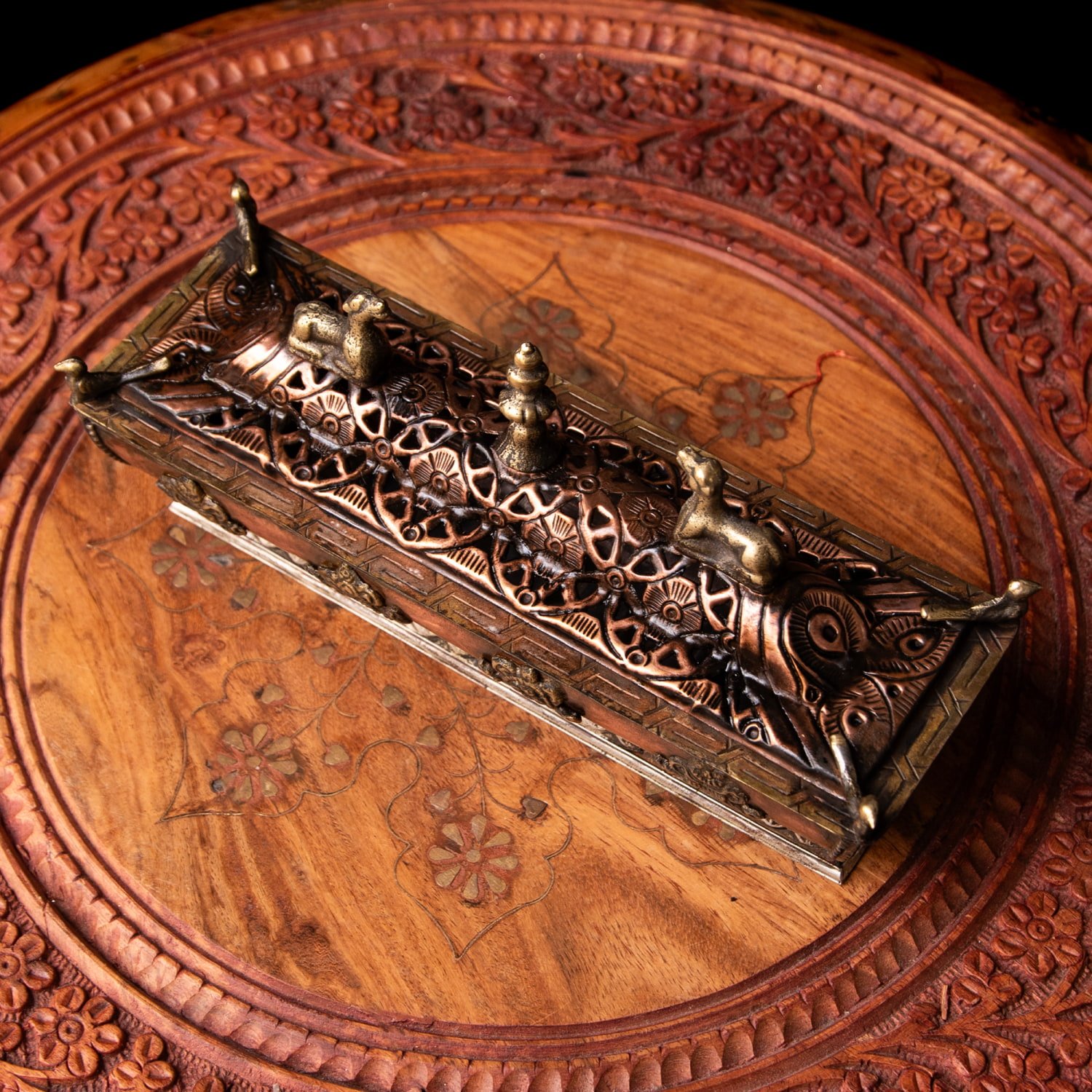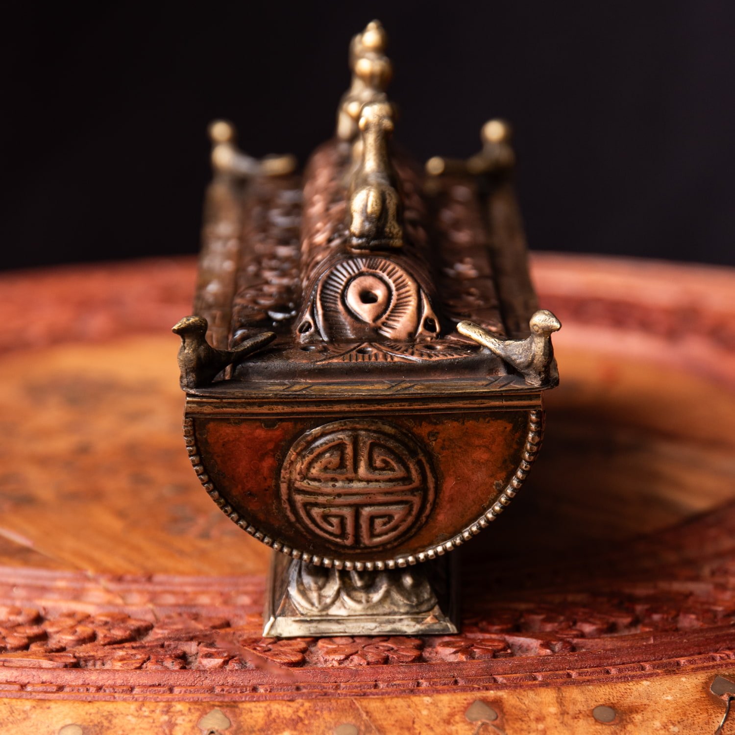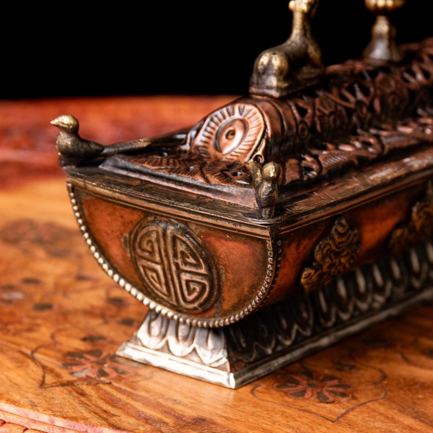 銅造り チベット香用 蓋付きお香立て 吉祥文様 【約21cm×約7.5cm】