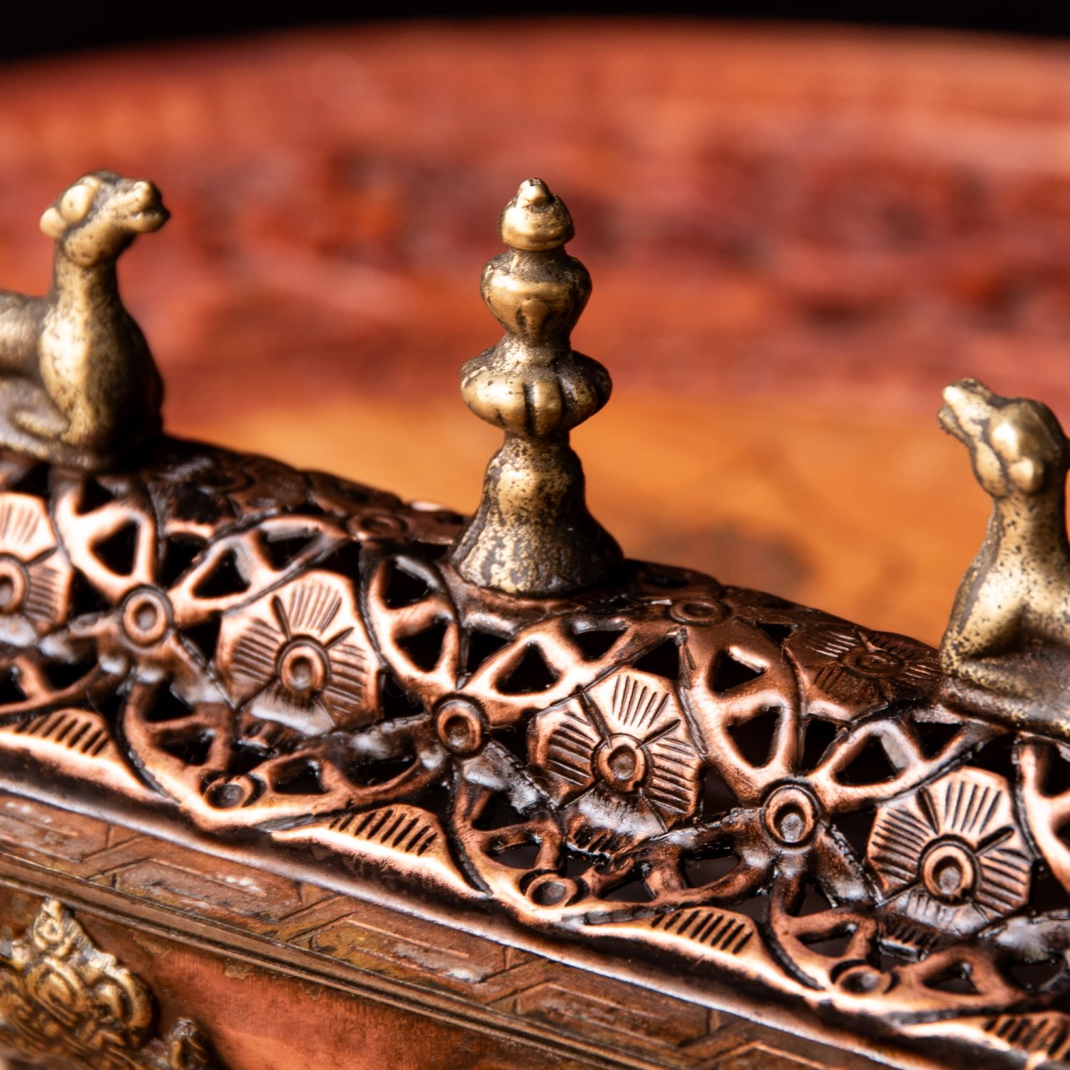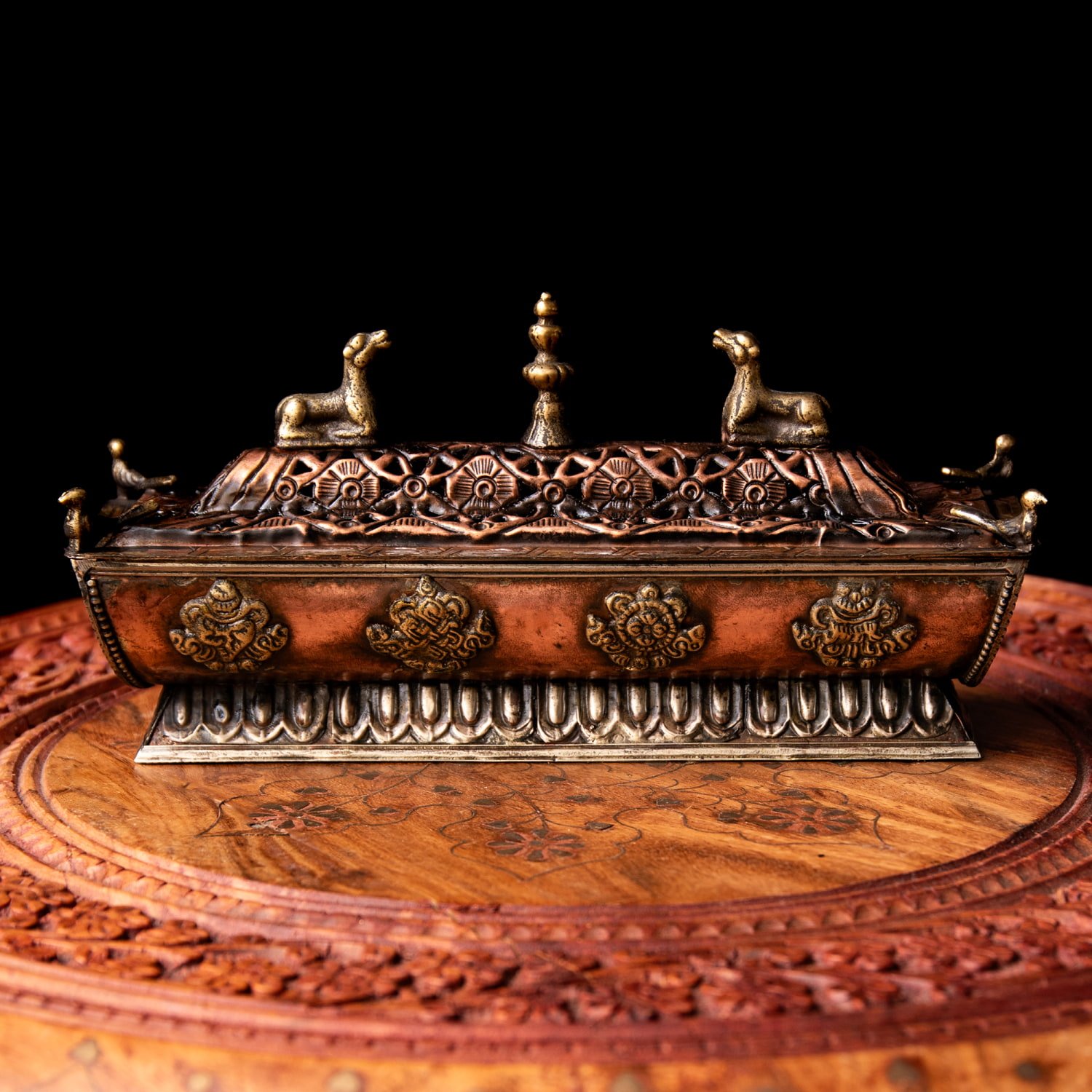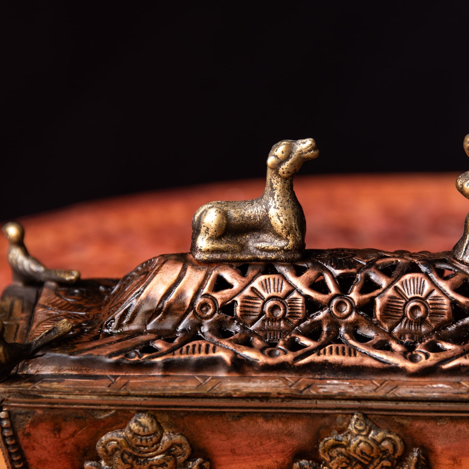 チベット寺院の屋根を模した蓋にはお釈迦様の教えを象徴する法輪を挟んで二匹の鹿が向かい合って座っています。側面にはチベット吉祥文様が施され、文化を感じられる一品です。