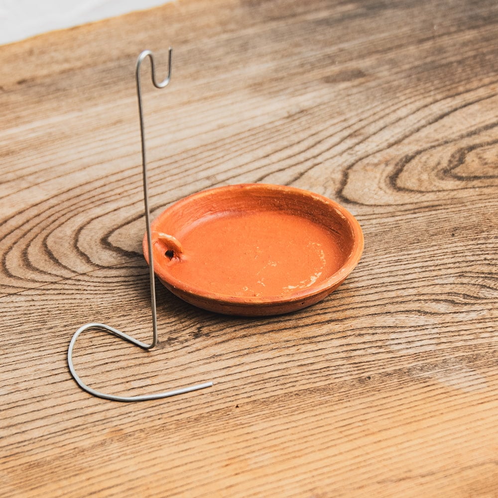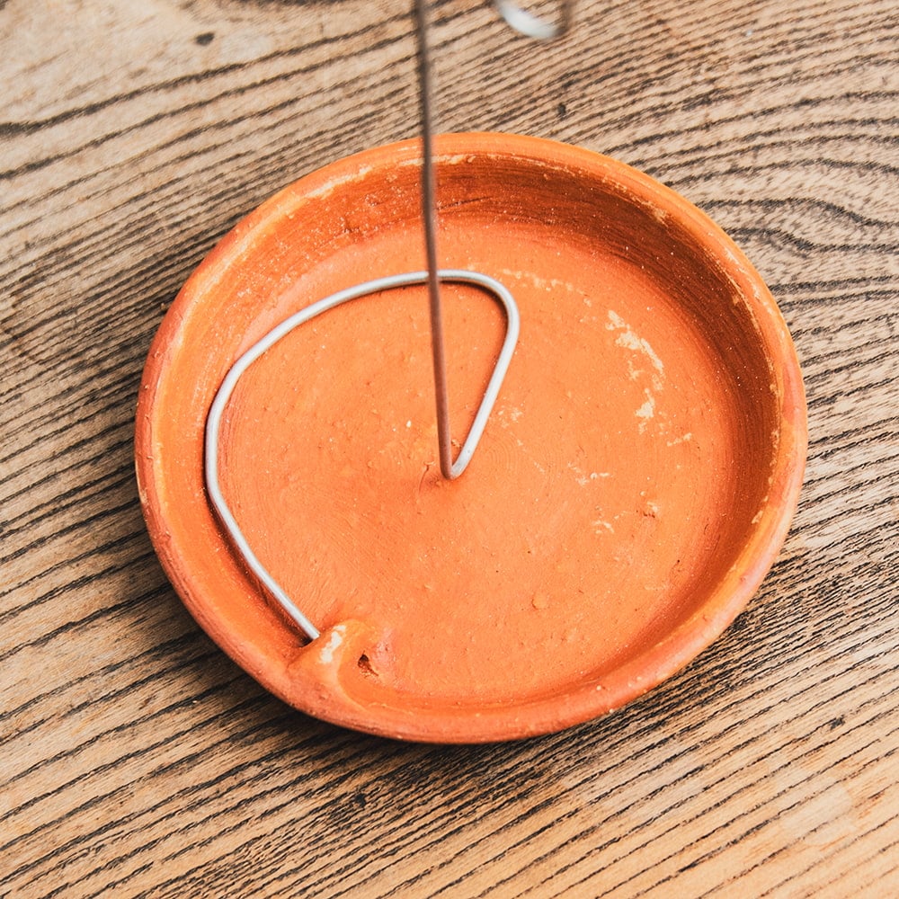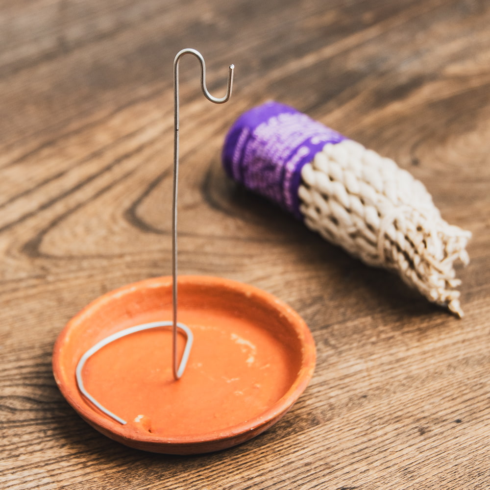素焼き小皿とワイヤーだけで出来た、とってもシンプルででスタイリッシュなお香立てです。一般的なお香用だけでなく、ネパールに伝統的に伝わるロープ状のお香を焚ける様にもデザインされています。機能美すら感じられる、ここまでシンプルなお香立ては、ありそうでありません。シンプルなだけに、使い込むほどに味わいのでる一品です。