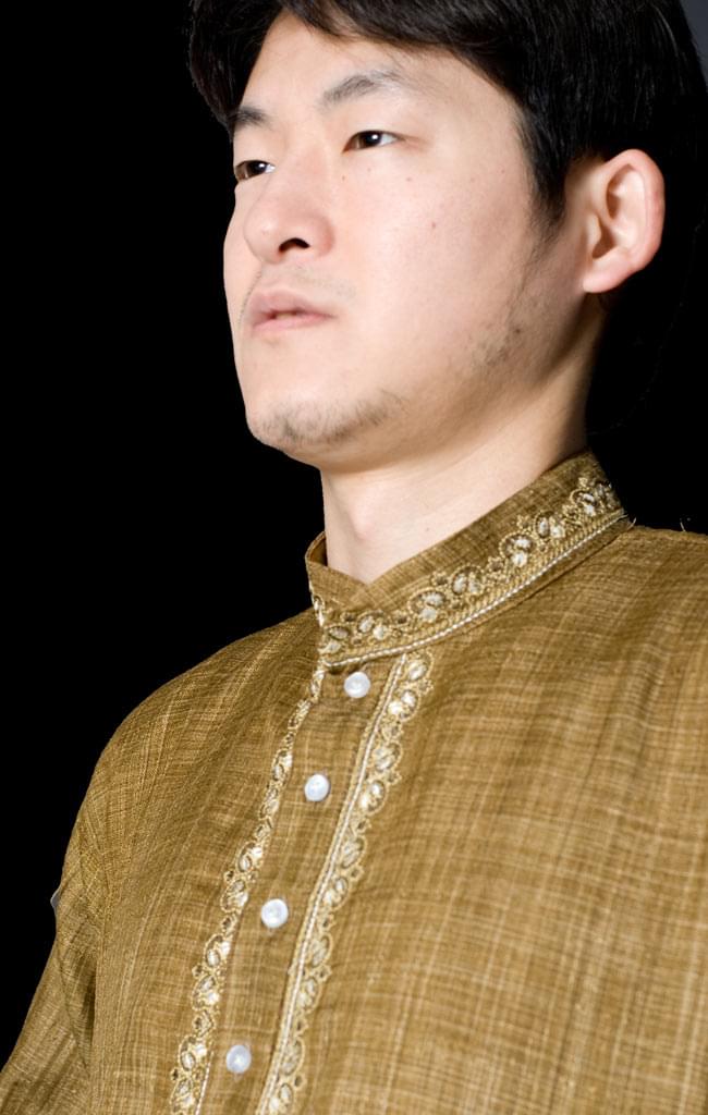 〔各色あり〕比翼仕立て 更紗刺繍入り クルタ・パジャマ上下セット インドの男性民族衣装