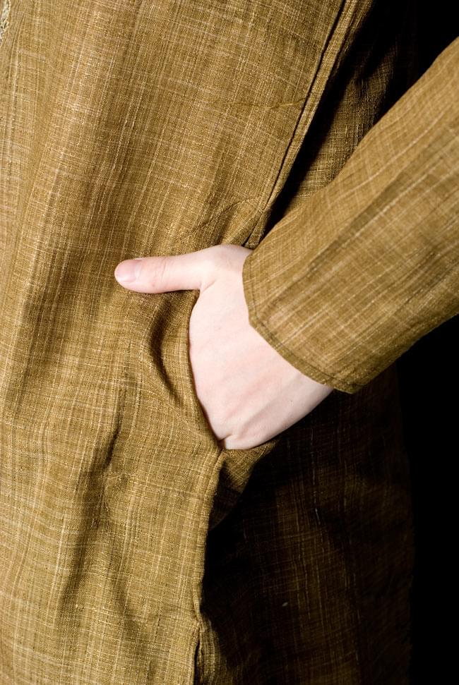 クルタ全体にこまかい地模様が織り出されています。地図記号の田んぼマークの繰り返しのような感じです。凹凸はうっすらで、刺繍とのバランスが絶妙です。ポケットは着た時の右側のみにありました。深さは14センチで使いやすい大きさです。