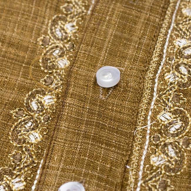 クルタは襟元と前たての刺繍が美しい。しっかりした機械刺繍なので洗濯にも耐えます。襟をとめるボタンはありません。楽ですが、自分はきちっと着たいので見えない部分にスナップをつけて閉じるようにしました。襟にはやや硬めの芯地がはいっています。きちんと感がありつつ、くつろぐのにも気にならない程度かと思います。