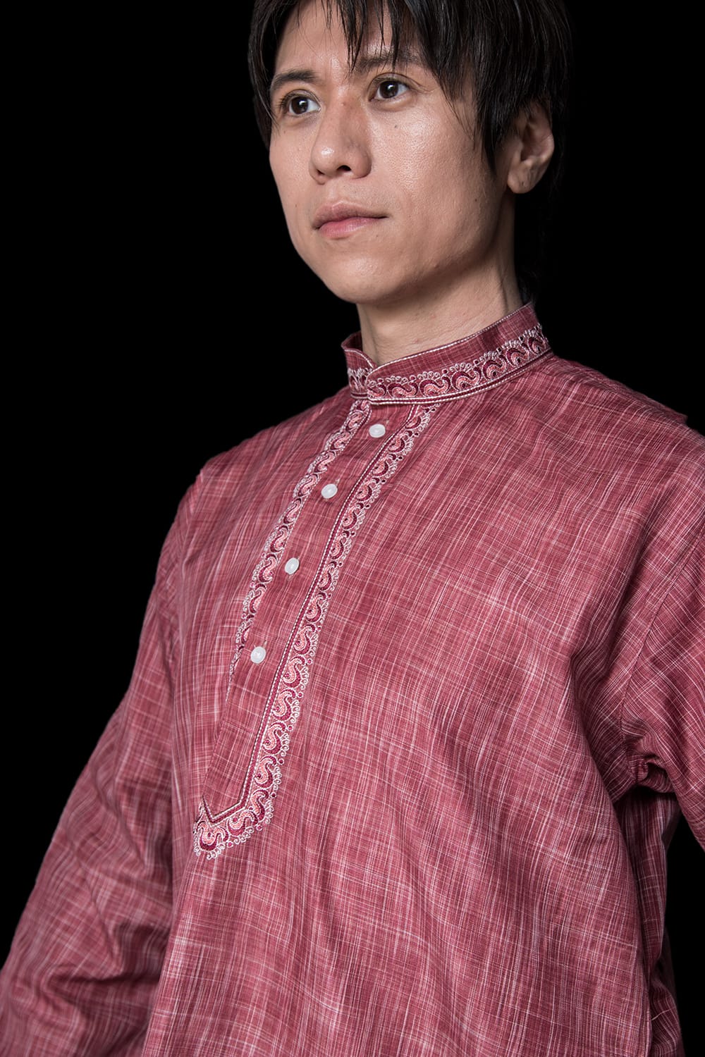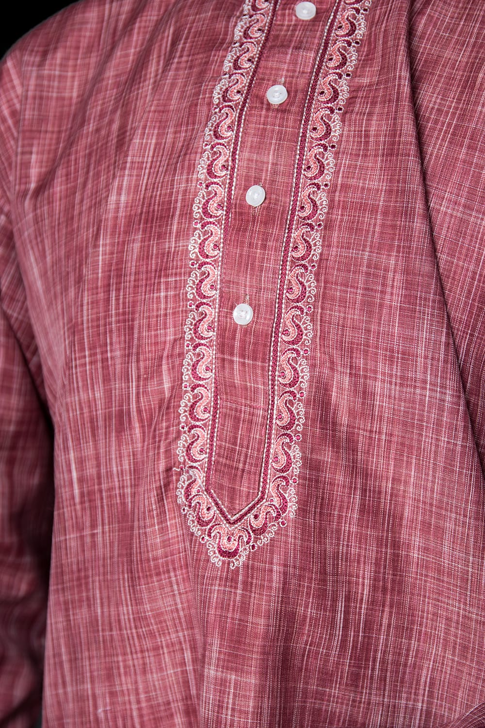 クルタは襟元と前たての刺繍が美しい。しっかりした機械刺繍なので洗濯にも耐えます。襟をとめるボタンはありません。楽ですが、自分はきちっと着たいので見えない部分にスナップをつけて閉じるようにしました。襟にはやや硬めの芯地がはいっています。きちんと感がありつつ、くつろぐのにも気にならない程度かと思います。