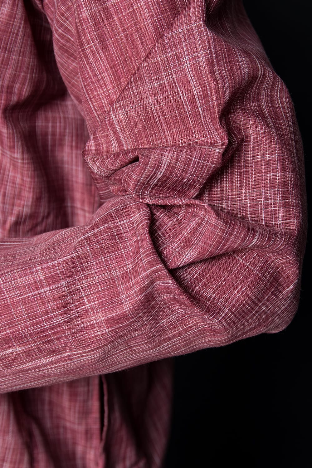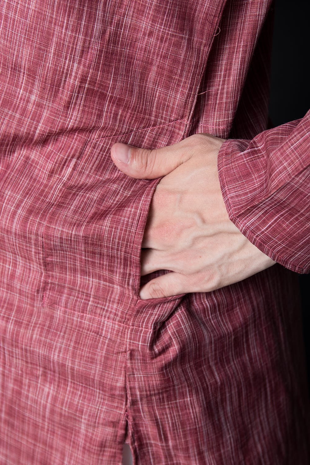 クルタ全体にこまかい地模様が織り出されています。地図記号の田んぼマークの繰り返しのような感じです。凹凸はうっすらで、刺繍とのバランスが絶妙です。ポケットは着た時の右側のみにありました。深さは14センチで使いやすい大きさです。