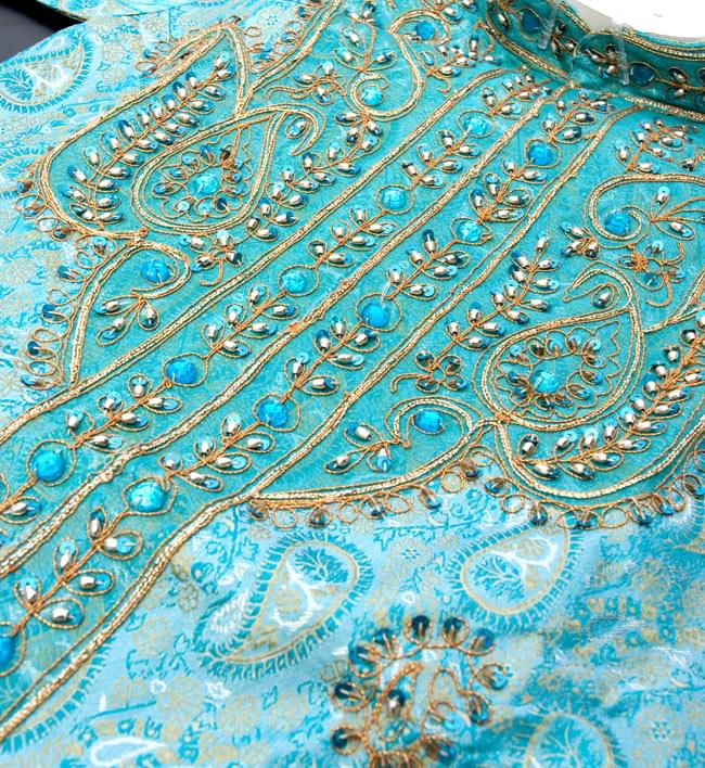 拡大写真です。ビーズ等で綺麗に装飾されております。また、服を綺麗な状態にしておく為に、針で留められている場合がございます。開封時はお気を付けください。