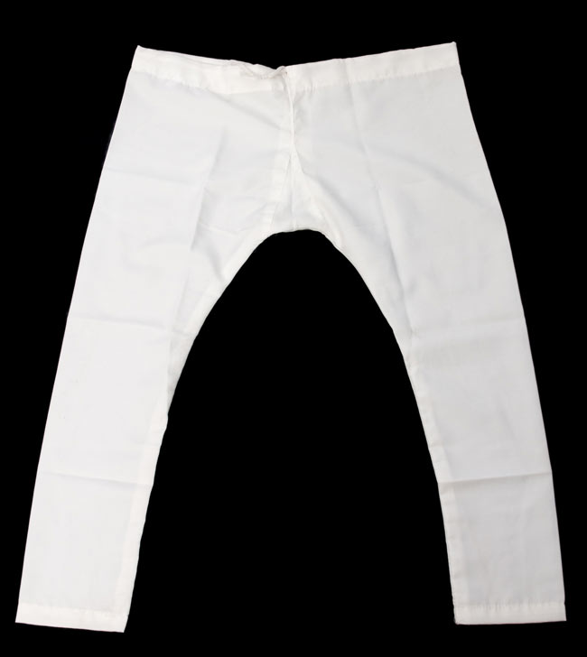 ズボンは紐で縛るタイプなので、ウエストはフリーサイズです。付属の紐をご自身で通した上でご使用ください。また、こちらは新品ですがインド製品の為、多少の汚れや一部小さな穴など生地の一部が若干傷ついている場合がございます。予めご了承下さい。