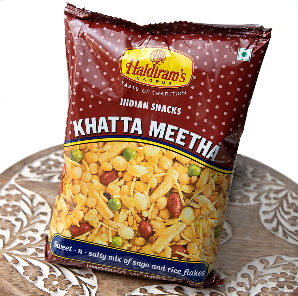 KHATTA MEETHA(カッタミータ)…とは、ヒンディー語で「すっぱい」、「甘い」と言う名前のままのお菓子です。甘い中にも微妙にすっぱいお菓子が混じる味加減がクセになるインドならではの味わいです。基本の揚げ菓子に、ダルと呼ばれる豆を揚げたものや、ポン菓子風のお米、マンゴー、グリンピースなどが混じり、えも言われぬ絶妙な味わいを作り出しています。