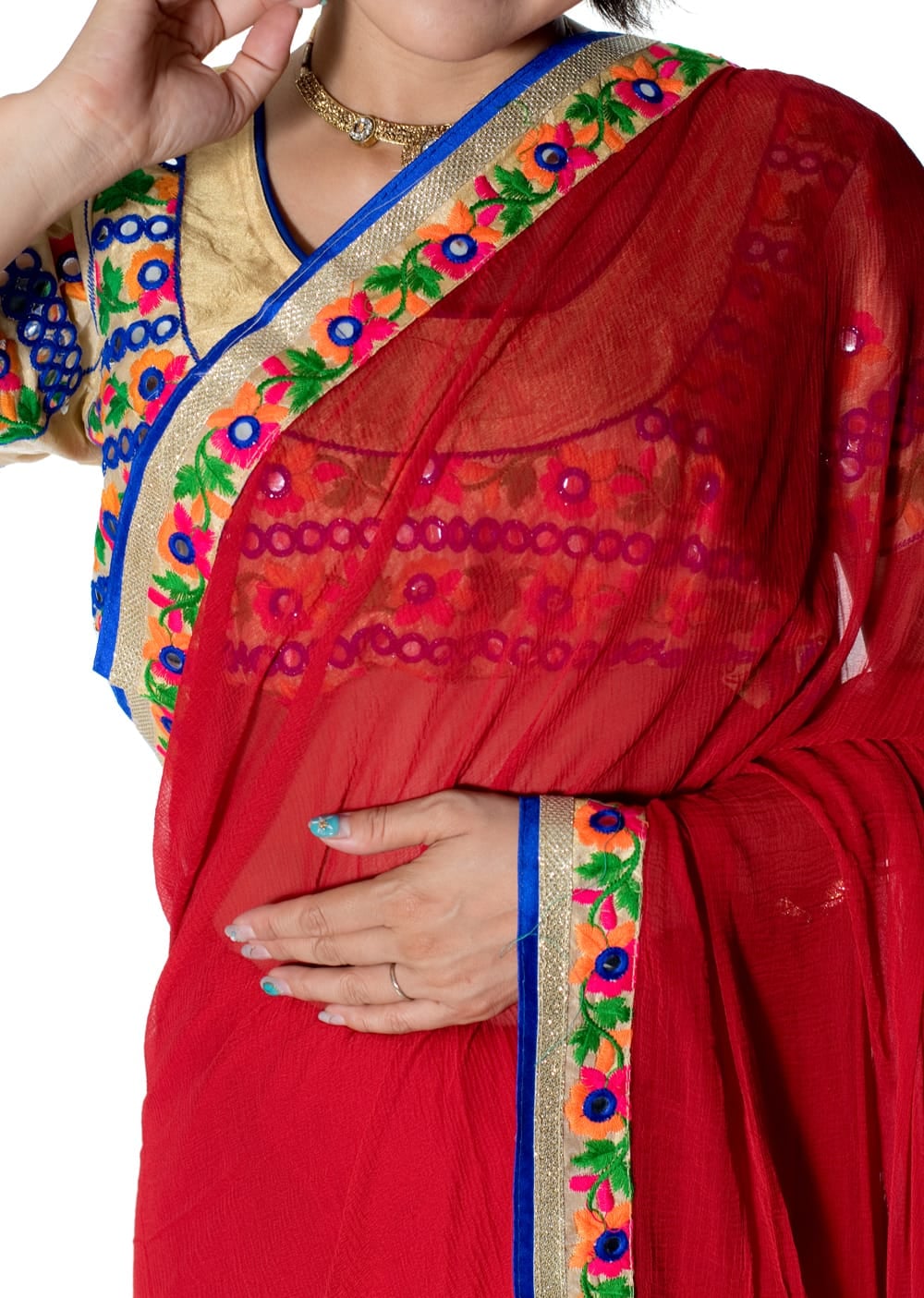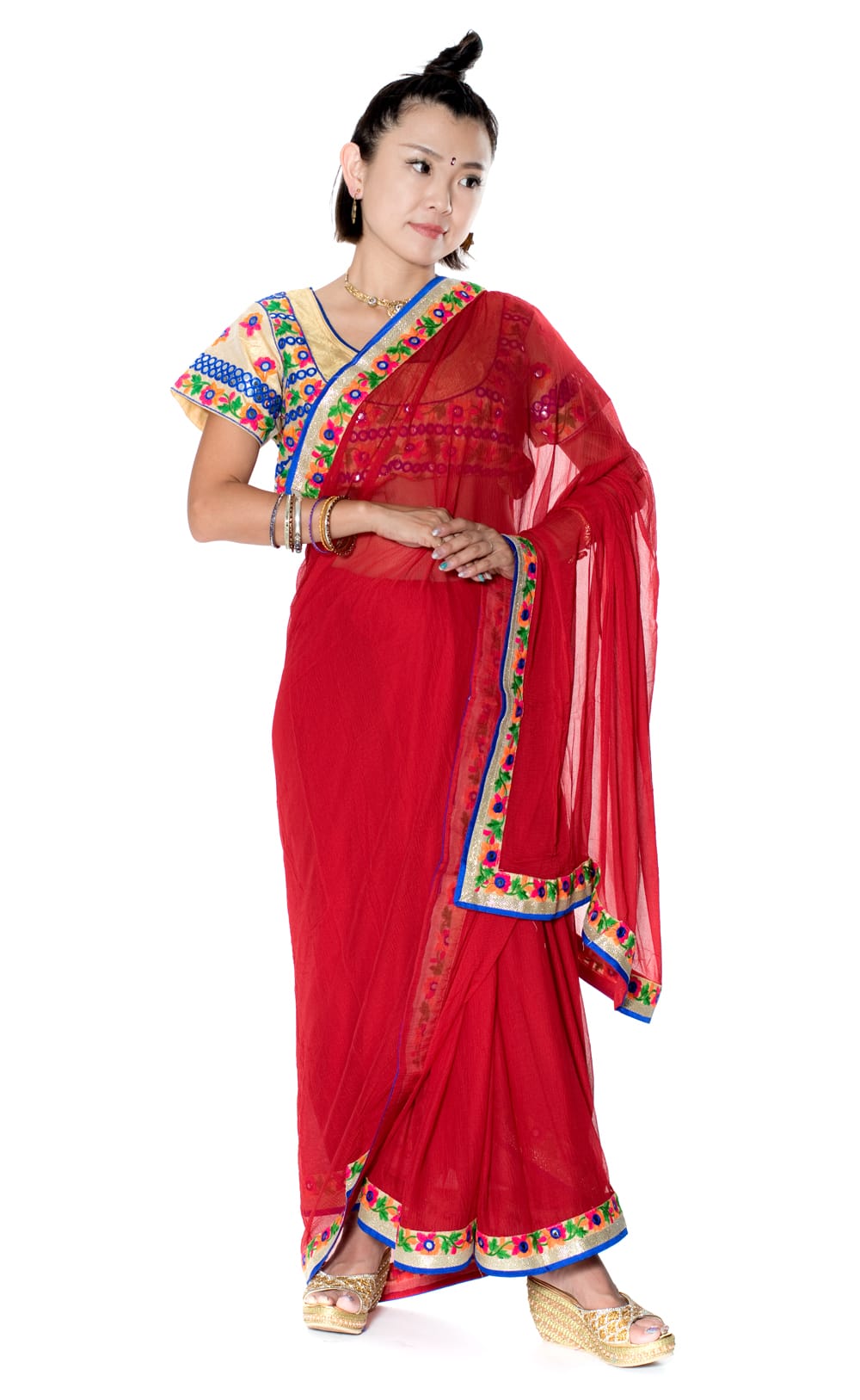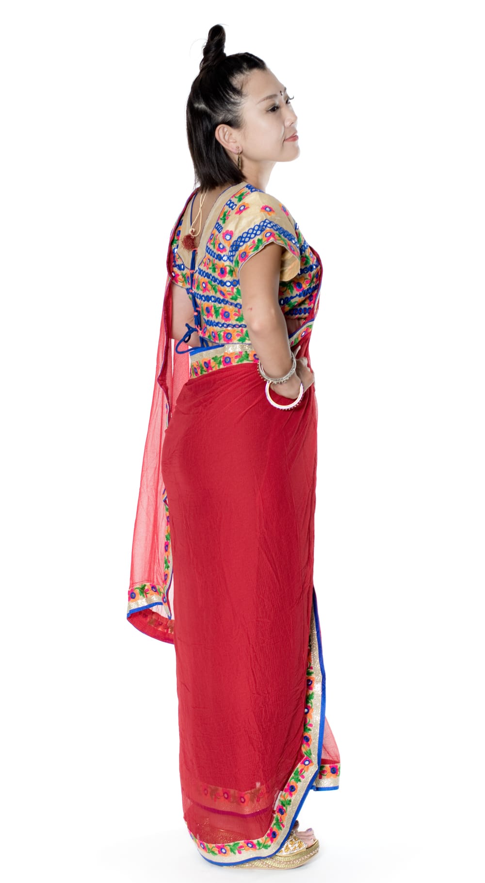 サリーはただの布ですので、完全にフリーサイズ。巻きの長さの調整をして頂ければ、安心してお楽しみ頂けます。カッチ刺繍テイストのジョーゼットインドサリー【チョリ付き】 - 赤の類似商品