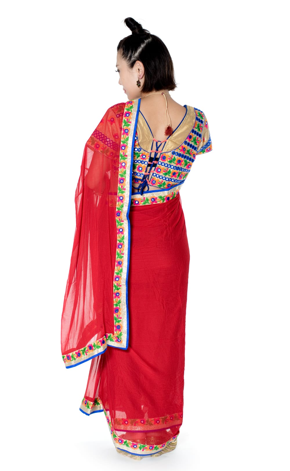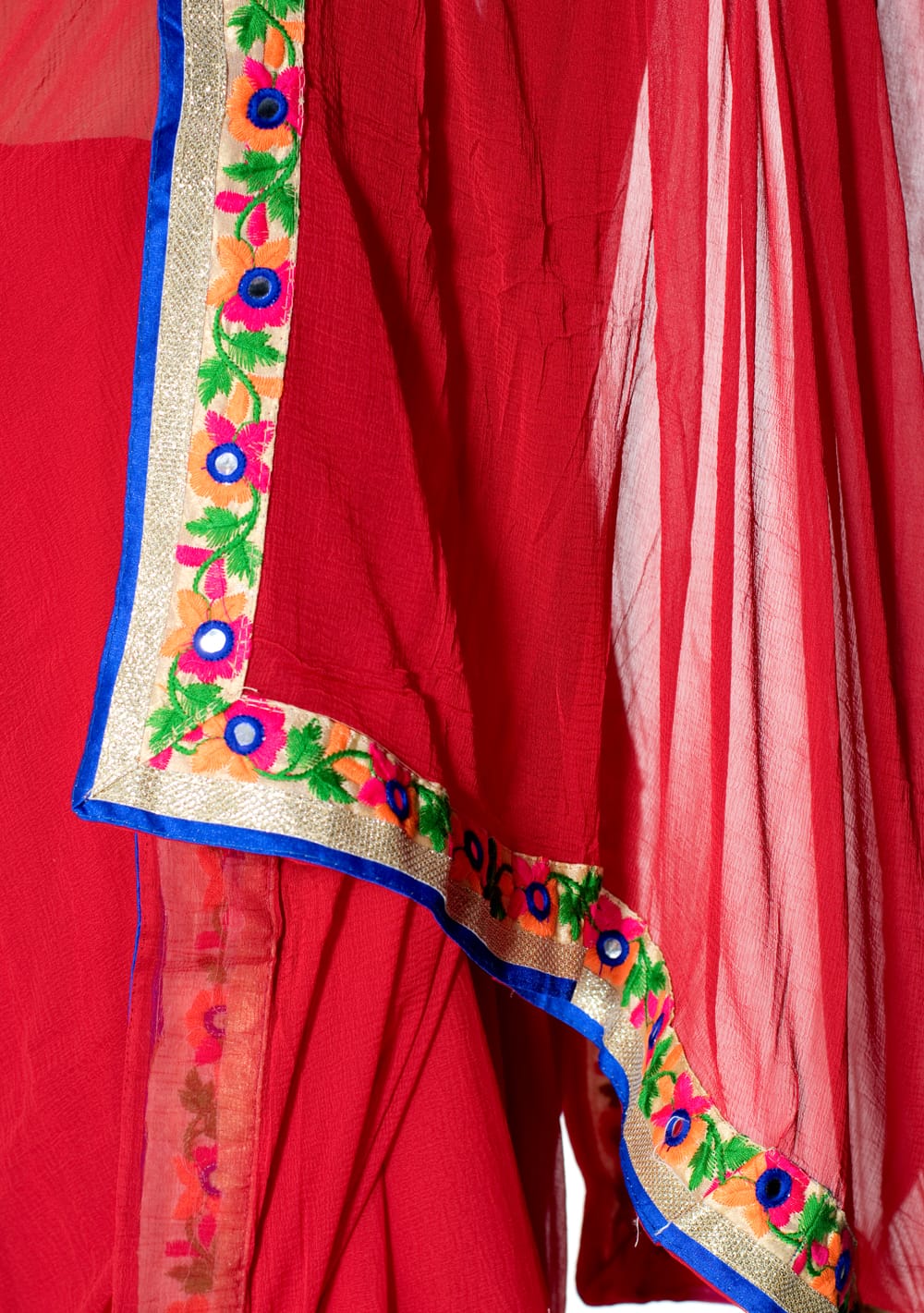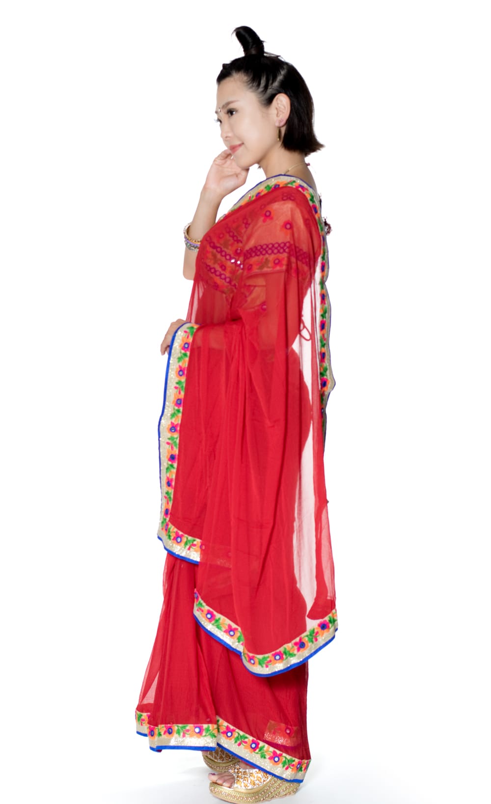 サリーはただの布ですので、完全にフリーサイズ。巻きの長さの調整をして頂ければ、安心してお楽しみ頂けます。カッチ刺繍テイストのジョーゼットインドサリー【チョリ付き】 - 赤の類似商品