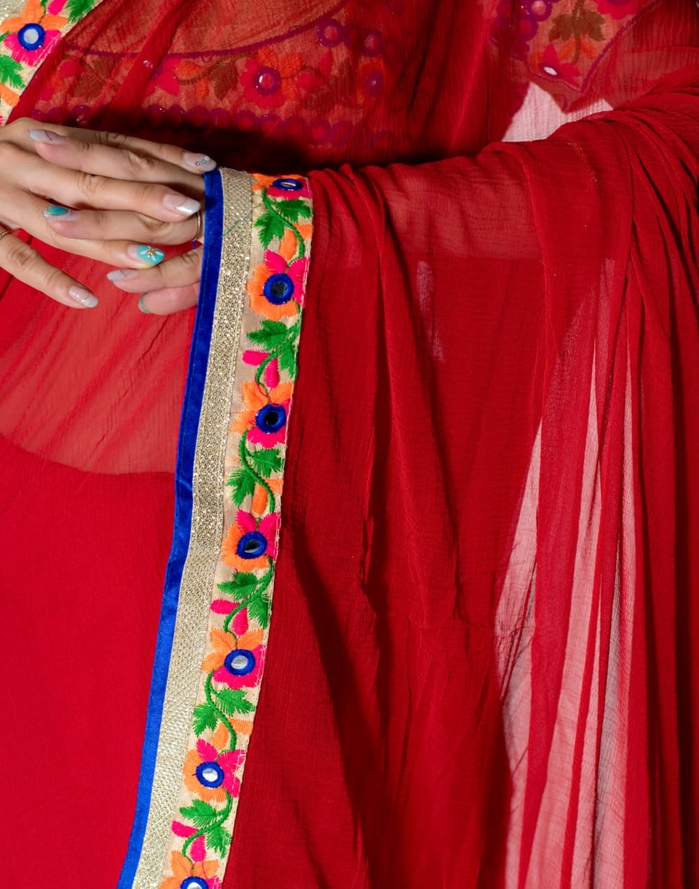 カッチ刺繍テイストのジョーゼットインドサリー【チョリ付き】 - 赤