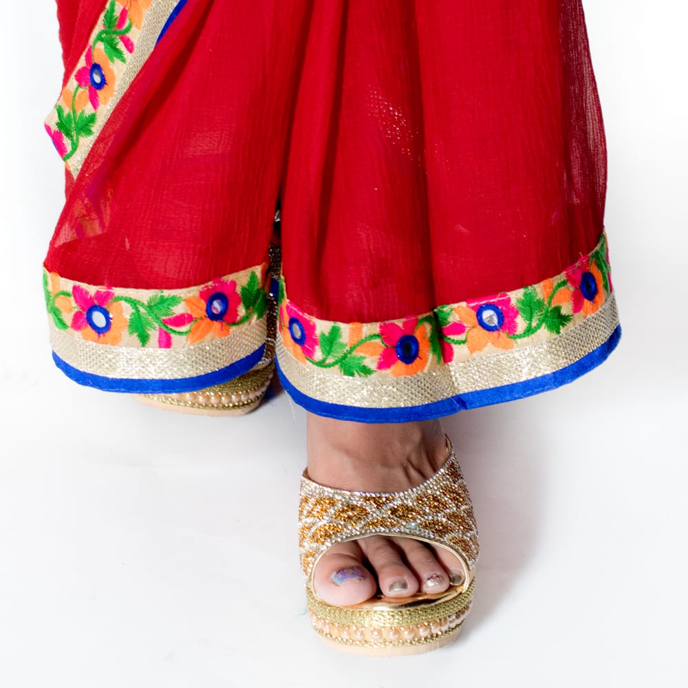 サリーに使われている生地は、薄手で透け感のある人気なジョーゼット生地。ふんわりとした着心地で軽やかです。そんなジョーゼット生地へ、美しいゴージャスな金糸やビーズを装飾。