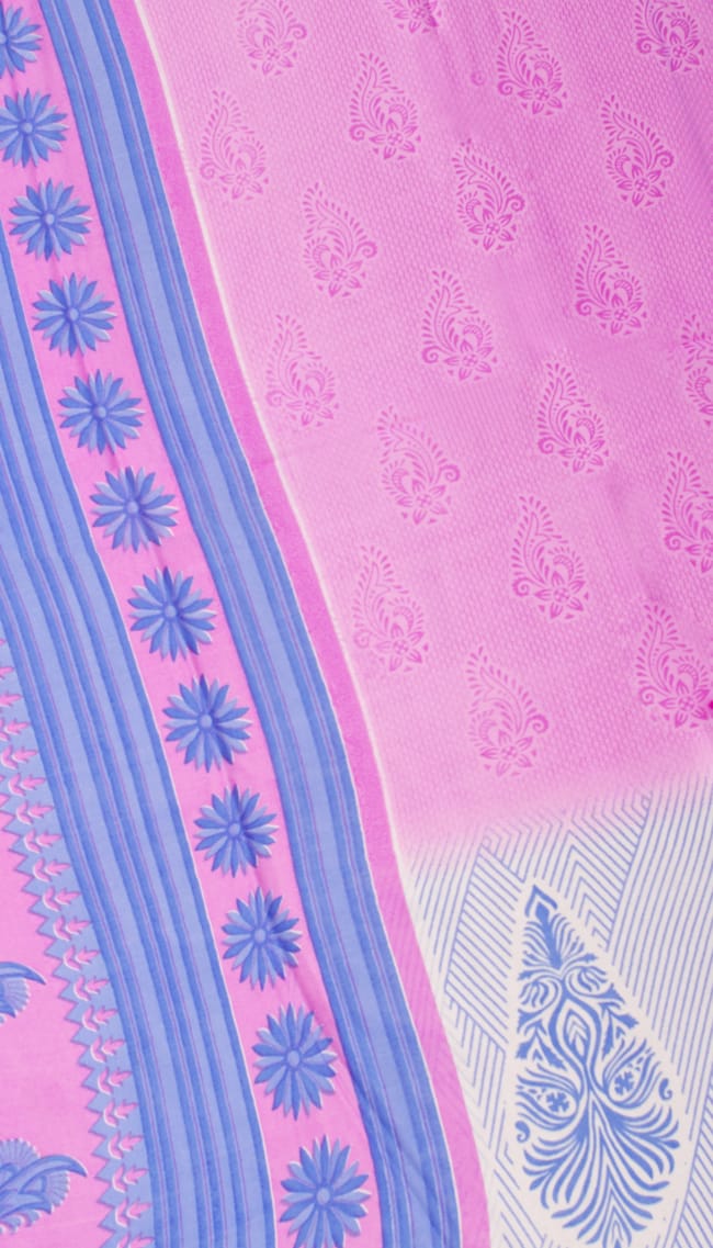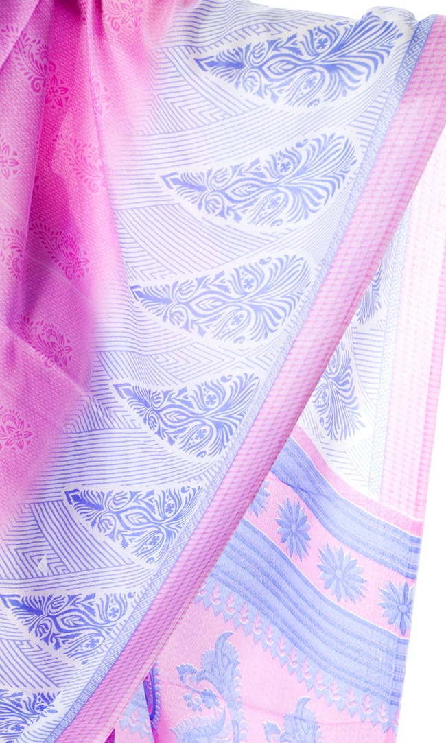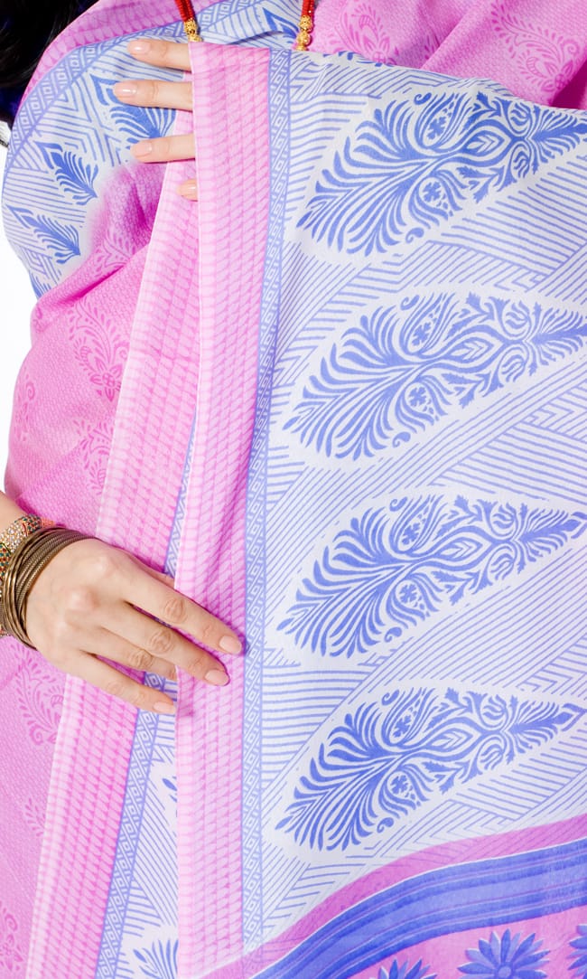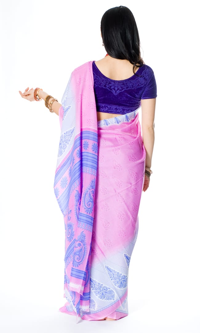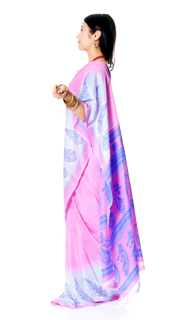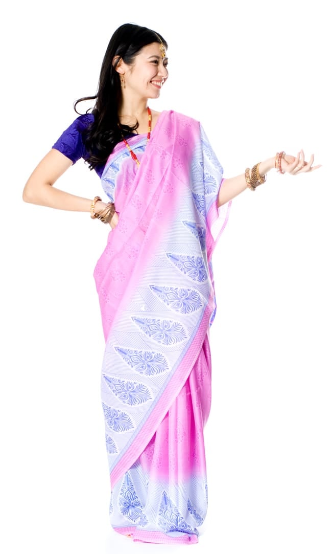 サリーは1枚の長方形の布を体に巻きつけて着用します。こちらのサリーは薄く透けるやわらかな肌心地の生地がしっとりと体を包み込んでくれる色鮮やかな一品です。色が鮮やかでとても美しいので、着るだけでまわりが明るくなりますね。5Mほどの大きな布地なので、どんな体格の方でも、自分仕様にお楽しみ頂けます。チョリやペチコートと合わせておしゃれに着こなして下さい。■着用以外の楽しみ方もあります。
