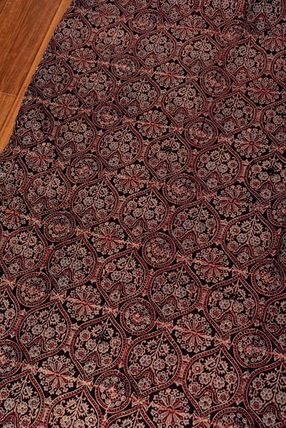 ウッドブロック(木版)を用いて一つ一つ模様を染めこんだ優雅で贅沢な仕上がりの布です。色が変わるたびに版を交換するため非常に時間のかかる丁寧な手仕事の賜物といえます。インドは美しい布の宝庫ですが、その中でも特に素敵な一枚に仕上がっています。