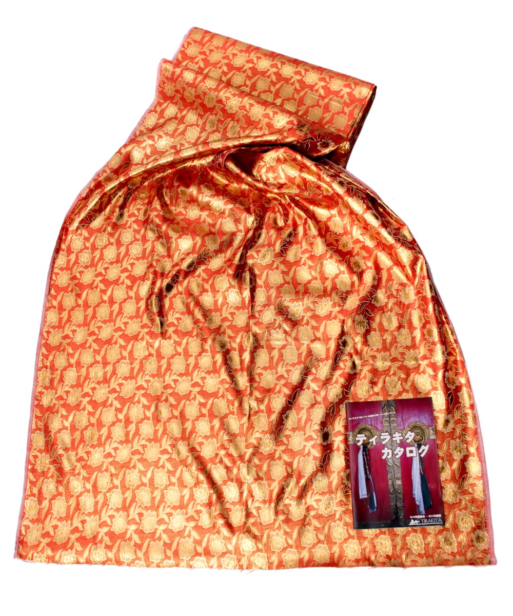 同じインドからやってきた『【MB-RSCLTH-332】〔1m切り売り〕インドの伝統柄ゴールドプリント光沢布〔幅約100cm〕 - ピンク』を、1mカットしてモデルさんに持ってもらった写真です。切り売りの布は基本的に横幅100cm前後と大きいので、ご覧の通り色々な用途に使えそうです。ご注文個数に応じた長さにカットしてお送りいたします。