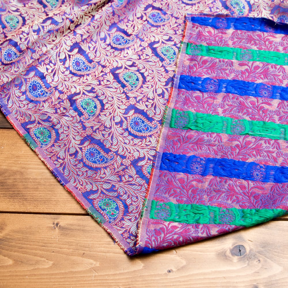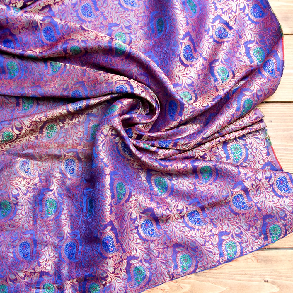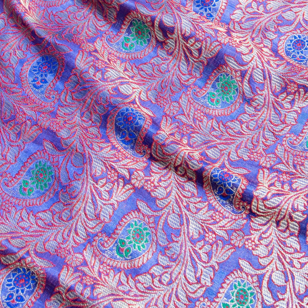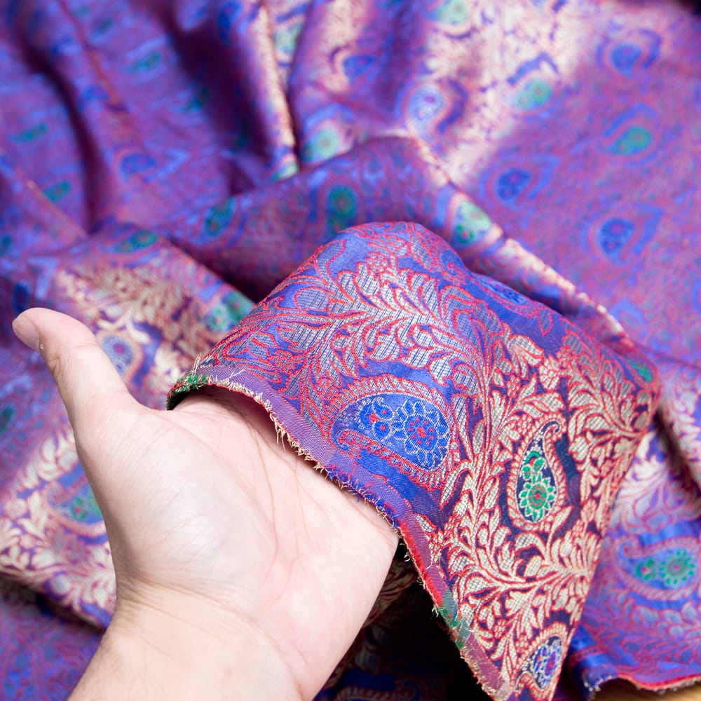 伝統的な紋様とインドらしい鮮やかなカラーリングがマッチングした素敵な布です。色合いが美しく、手芸用の布としてはもちろんインテリア用のカバーや飾り布として様々な場所でお使いいただけます。ソファカバーやカーテン、等々色々な使いみちが考えられますね。陰影が美しいので、オリジナルのスカーフや壁飾りにしても素敵です。
