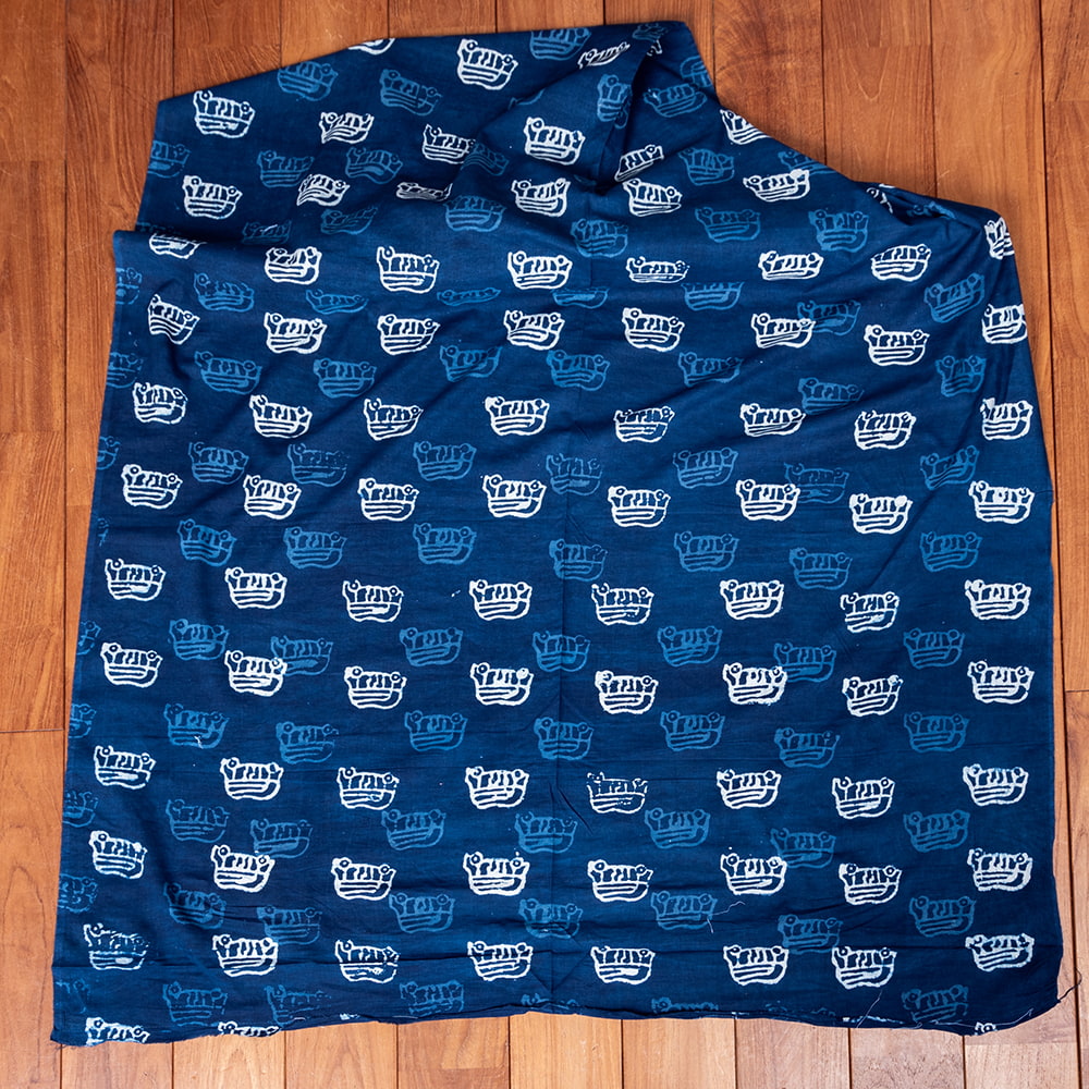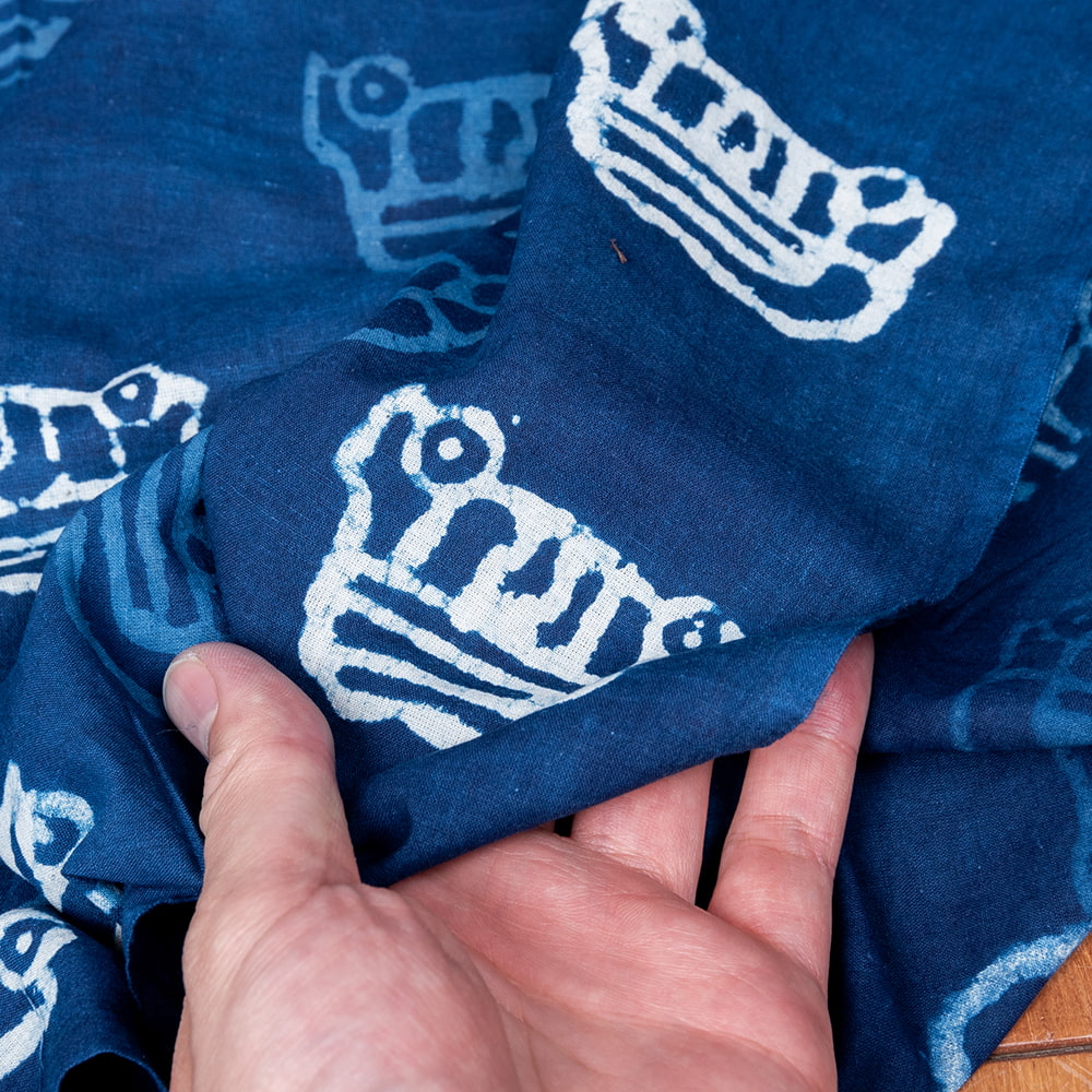 インドらしい伝統的な模様にインディゴの美しい青がマッチングした素敵な布です。泥染め(ダブプリント)によるシンプルなパターンの連なりと落ち着いた風合いは見ていて決して飽きることがありません。泥染めは、布地が染まるのを防ぐ泥状のペーストを模様が彫られたウッドブロック(木版)につけて布に押していきます。そして布につけたペースとへ、細かくなった小麦の籾殻を撒きます。そうすると小麦の皮が先ほどの泥にくっついてくれるので天日干しします。