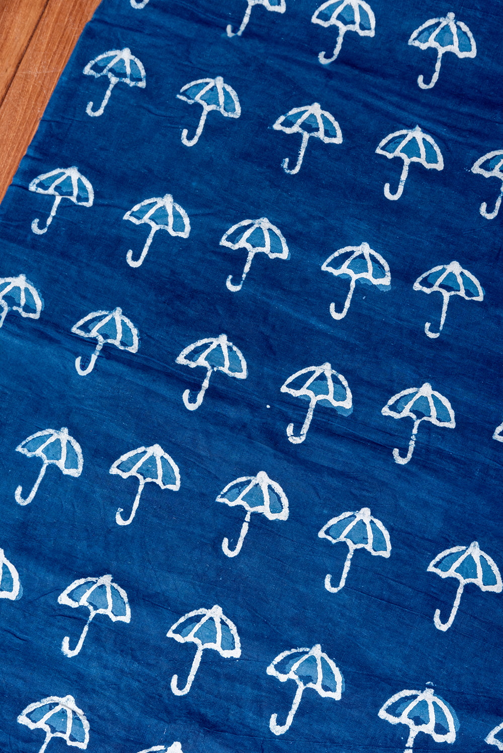 そして藍染めの液に浸しては乾かし、またウッドブロックで判子を押して…ということを綺麗なインディゴの青になるまで何度も繰り返し大変手間暇をかけ作られています。この泥染めの歴史は、インドのアコラ村付近で8世紀頃から始まったと言われており歴史のある製法です。