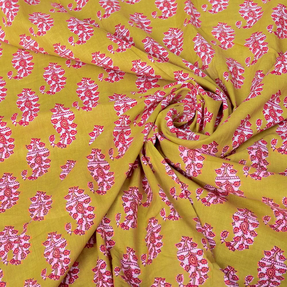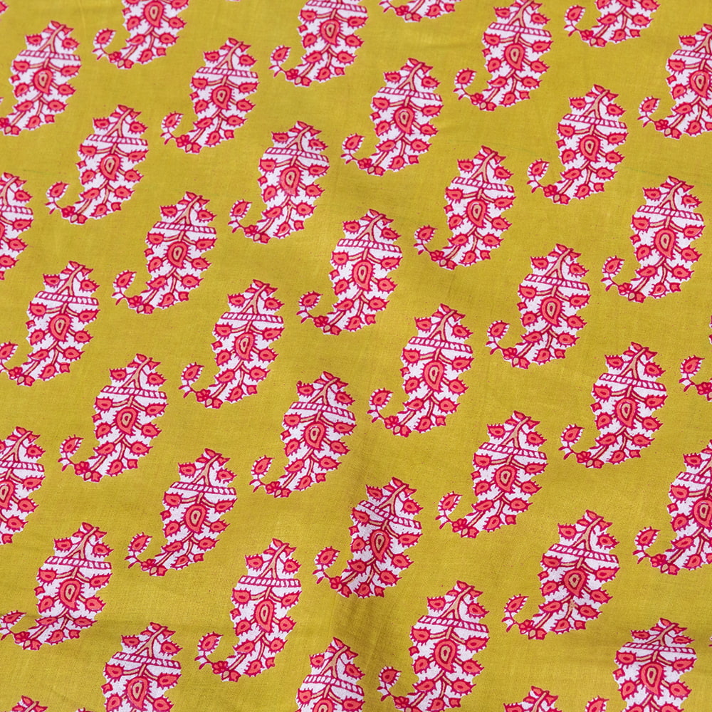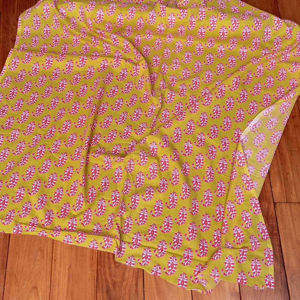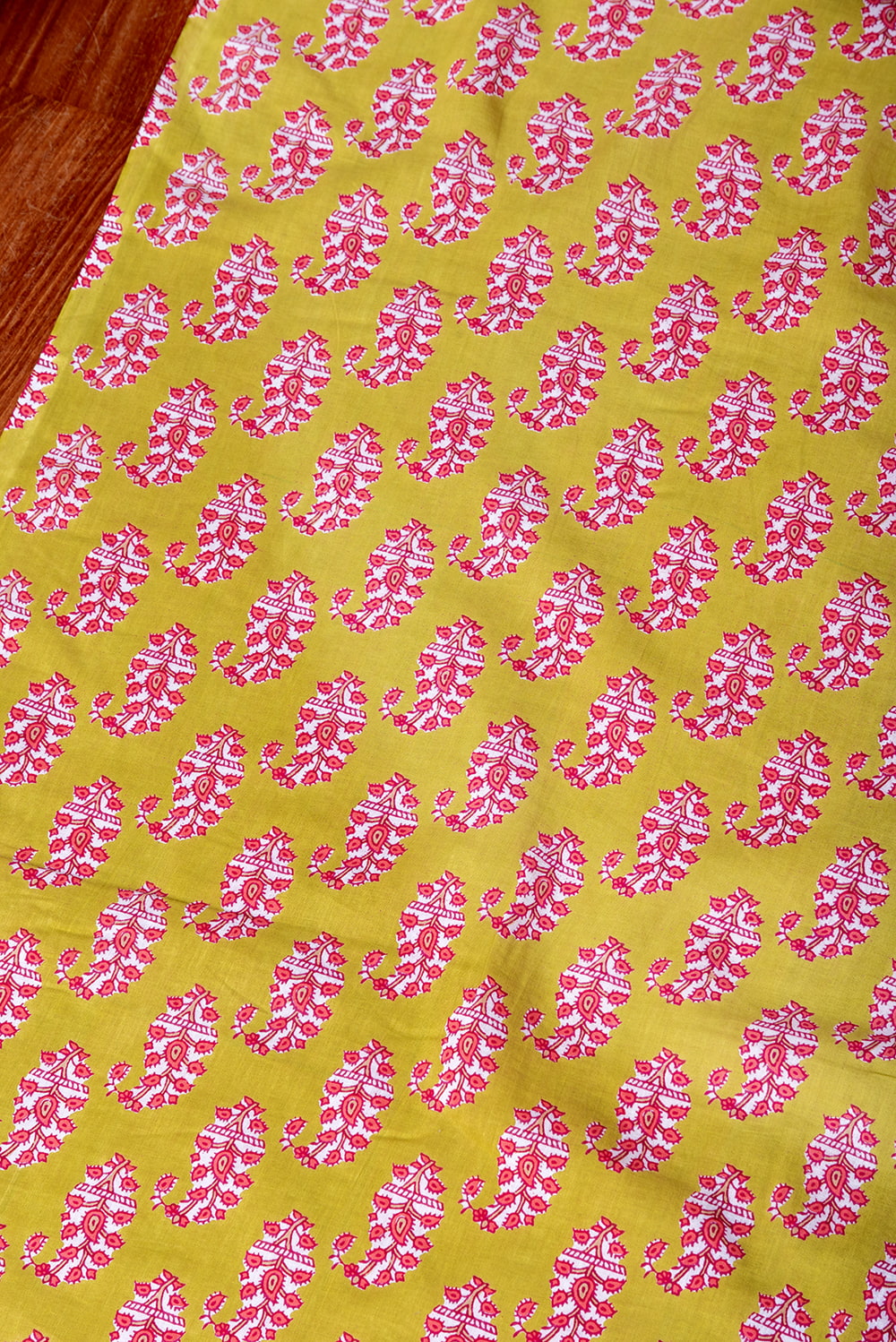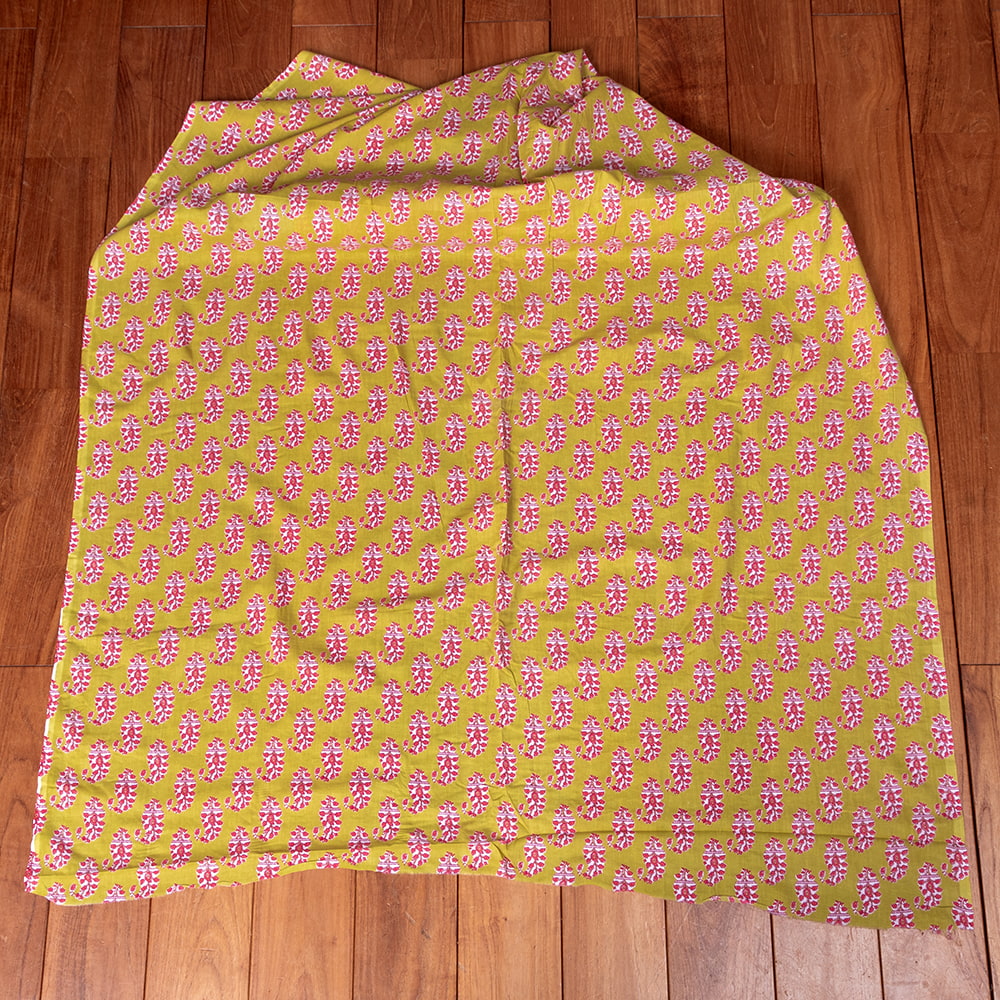〔1m単位切り売り〕南インドの民族模様 昔ながらのペイズリー布 黄緑系〔幅約109cm〕 x 3個