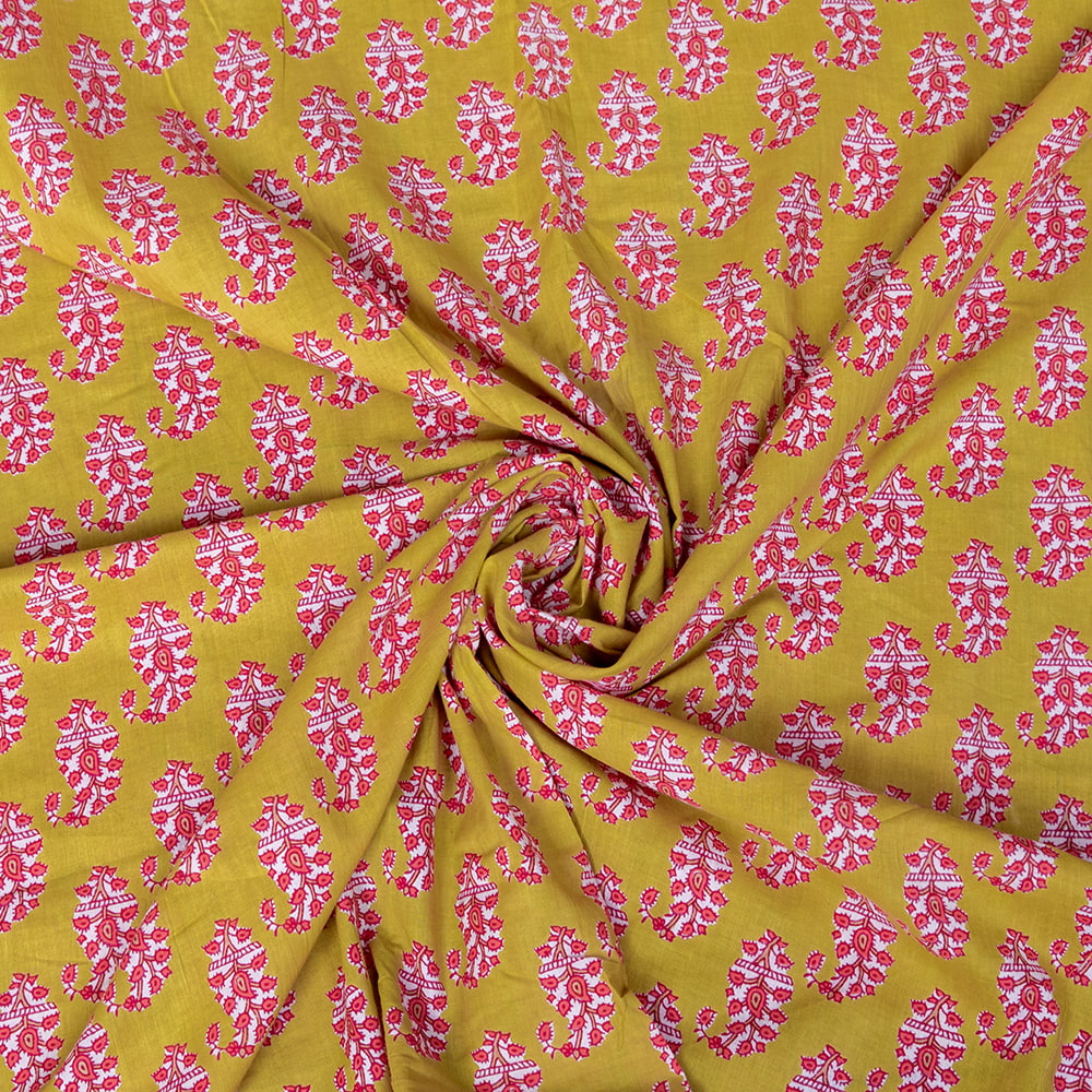 【3個セット】〔1m単位切り売り〕南インドの民族模様 昔ながらのペイズリー布 黄緑系〔幅約109cm〕